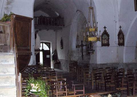 Au cours de la phase d’embellissement entreprise dans les premières années du XVIIe s., comme l’attestent une inscription gravée sur le linteau de la fenêtre sud du chœur (tituli du Christ et de la Vierge : IHS, AM) et la date du 8 novembre 1603, fut mis en place un grand retable à colonnes torses garnies de pampres et d’oiseaux. Ce décor fut complété à la fin du XVIIIe s. par la réalisation d’un remarquable programme iconographique peint représentant, sur un ciel azuré tramé de rinceaux aux tonalités gris bleu, la Vierge, les évangélistes, l’Agneau pascal et des attributs d’évêques.
