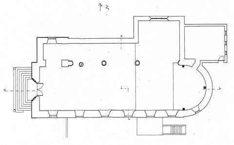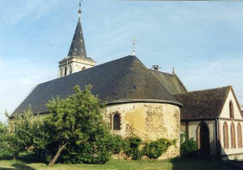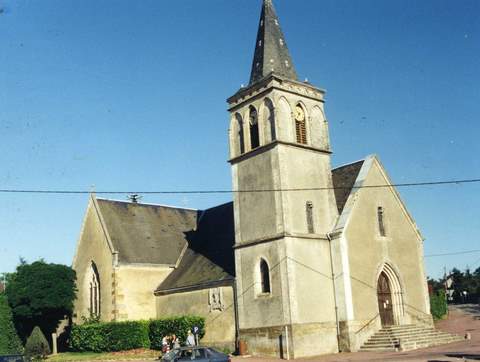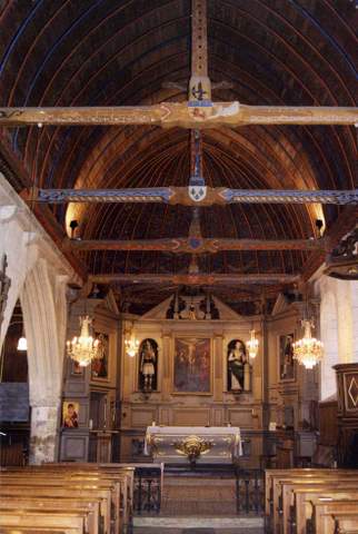 Si l’extérieur de l’église ne retient guère l’attention – ses abords non aménagés et assez disgracieux y contribuent -, l’intérieur, lui, présente un riche et intéressant décor. En effet, la nef est couverte d’une belle voûte en charpente lambrissée de haut volume et au profil brisé dont la totalité de la surface est dotée d’un décor peint au pochoir avec des rehauts de rouge, gris-bleu, noir. Poinçons et entraits sont sculptés et peints. Des têtes engoulantes armoriées décorent les parties centrales des entraits. La voûte du chœur présente un décor de rinceaux bleus, particulièrement soigné, probablement repris au XIXe s., mais de grande qualité décorative. Le chœur est occupé par un important maître-autel à retable, à trois pans, qui n’épouse donc pas l’arrondi de la maçonnerie et qui dissimule les poteaux de la charpente décorés de pilastres ioniques. Le panneau central, couronné d’un fronton brisé, est encadré de panneaux latéraux à frontons triangulaires. Niches, pilastres à chapiteaux corinthiens et obélisques complètent cette production. Le collatéral est lui aussi couvert d’une voûte lambrissée à décor peint de bandes rouges, gris-bleu ainsi que noires et à festons blancs et motifs végétaux .