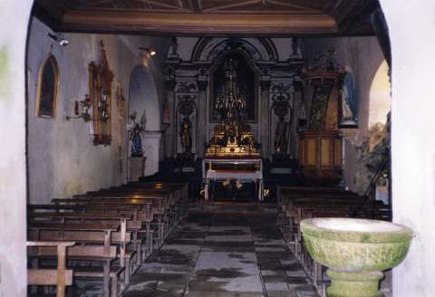 L’intérêt de l’édifice provient surtout du mobilier qu’il abrite. Un joli retable (classé M.H. en 1987) occupe le fond du chœur à chevet plat. Le maître-autel est daté de 1776. Il est surmonté d’un tableau représentant la Crucifixion, avec Marie-Madeleine au pied de la Croix, et encadré des statues en bois doré de saint Maurice et de saint Jean-Baptiste. Dans la chapelle sud, un retable en bois peint illustre diverses scènes de la vie du Christ dans un style populaire (inscrit I.S. des O.A.). Le panneau peint de la porte de la sacristie, daté de 1760, représente l’Annonciation (inscrit I.S. des O.A.)