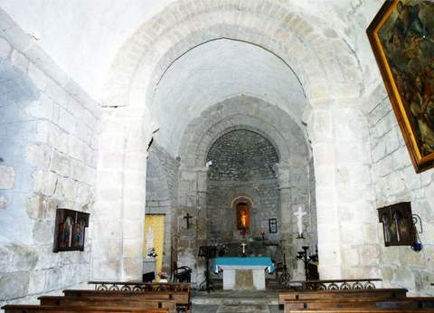 La première travée de la nef, voûtée en berceau brisé dont un cordon en quart de rond souligne le départ, a été refaite et correspond à deux travées originaires, comme l’atteste le rythme des contreforts à l’extérieur. La seconde travée actuelle (en réalité la troisième) ne paraît pas avoir été modifiée. Elle a conservé sa voûte ancienne en berceau brisé. Son cordon, mouluré selon le même profil, est moins épais et règne un peu plus haut. Un arc doubleau à deux rouleaux sépare les travées, un autre précède le chœur ; ils retombent sur des colonnes engagées dans des dosserets par l’intermédiaire de chapiteaux à tailloirs simplement moulurés d’un bandeau sur un cavet. Les sculptures de ces chapiteaux contribuent beaucoup à l’intérêt du monument. Le chapiteau nord est tapissé de palmettes schématiques au tracé anguleux. Le chapiteau sud offre une corbeille nue avec des crochets aux angles. À l’entrée du chœur, le chapiteau nord présente deux grands crochets sortant de palmettes creusées dans les angles et un motif stylisé au milieu. Au sud, c’est un animal assis, les pattes allongées, la tête vers la gauche, sans doute image naïve d’un lion. Une rangée de dents de scie le surmonte.