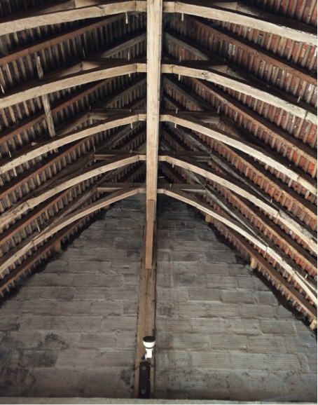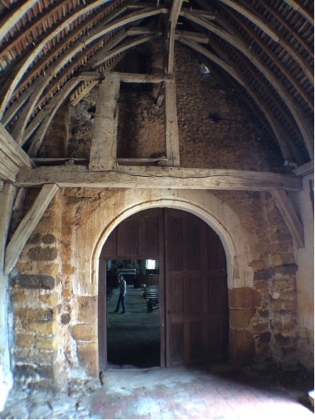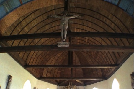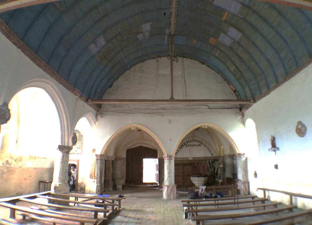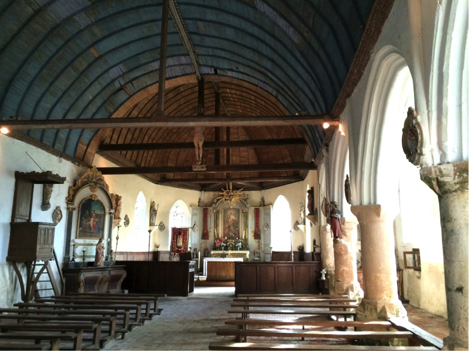 La nef est dotée d’une charpente à chevrons formant ferme et qui pourrait dater du XIIIe siècle. Celle-ci conserve son couvrement d’origine : une voûte en berceau brisé, lambrissée avec couvre-joints moulurés. L’ensemble des merrains et couvre-joints est actuellement peint en bleu, où les multiples nuances ou absence permettent de lire les différentes reprises. Une fenêtre sommitale de sondage laisse apparaître un décor sous-jacent de frise noire à trois points sur fond laissé en bois naturel. La nef est également prolongée par un chœur de même largeur à une travée droite et se terminant par une abside à trois pans.