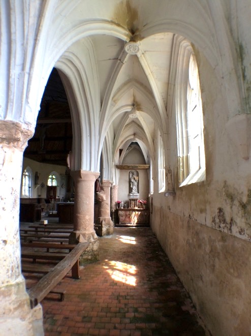 L’église est établie selon un plan rectangulaire, orienté Sud-Ouest/Nord-Est. Le corps de l’église se caractérise par une nef comprenant trois travées. Dans la première s’installe la structure porteuse du clocher aménagée pour former un pseudo-narthex. La nef est épaulée d’un étroit bas-côté Sud découpé en quatre travées pouvant être assimilées à des chapelles. Chacune d’entre elle est voûtée en pierre sur croisée d’ogives aux nervures à profil gothique et à clefs circulaires ornées de fleurons, de personnages nus, de rinceaux et de monstres.