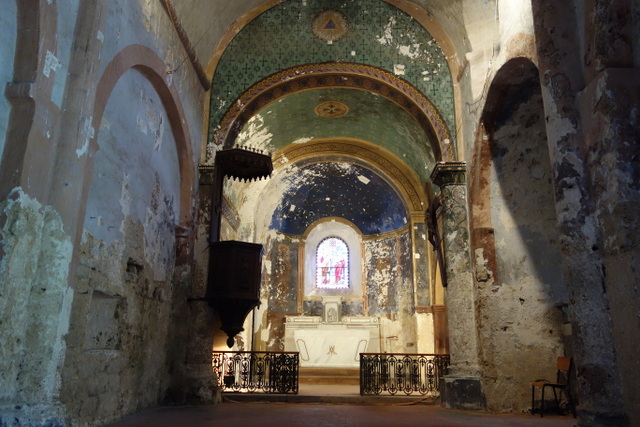 La nef est surmontée d’une voûte en berceau en plein cintre.
