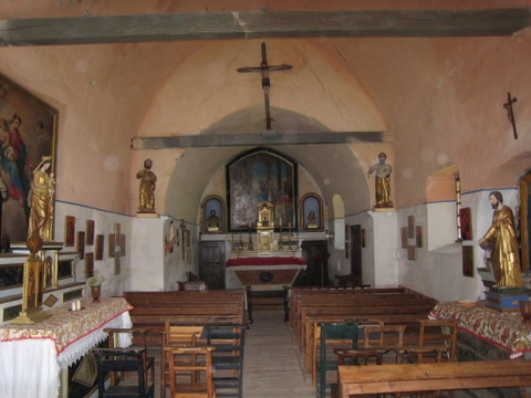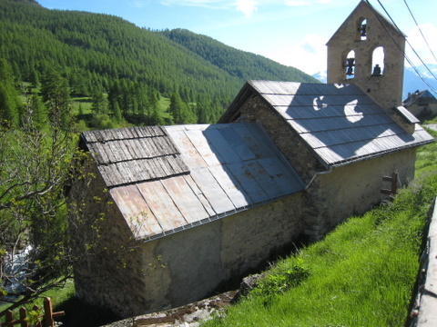 Petite église de montagne composée d’une nef unique et d’un chœur légèrement plus étroit que la nef, prolongé par une sacristie de plan rectangulaire. Voûtée en berceau, elle possède très peu d’ouvertures (il n’y en a pas au nord). Sa couverture en bardeaux (et tôle). Les murs sont composés de moellon enduit. Un clocher peigne surmonte le mur ouest et un Auvent charpenté protège la porte d’entrée.