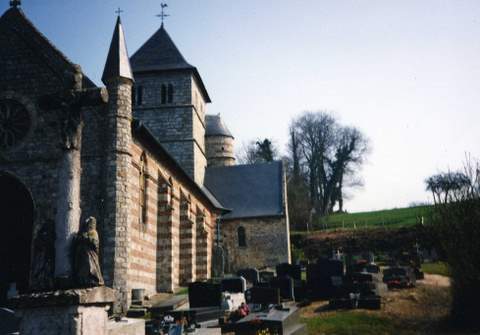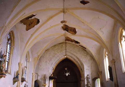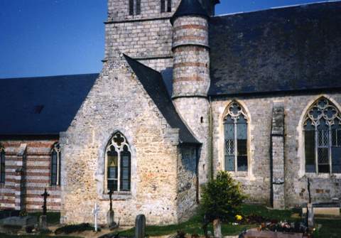 L’église de Saint-Pierre-le-Vieux, placée sous le vocable de saint Pierre, est agréablement située à mi-pente d’un vallon dominant la rivière de Dun. Elle est ainsi dénommée pour la distinguer de l’église de Saint-Pierre-le-Petit, démolie en 1823, au moment du rattachement de cette commune toute proche à celle de Saint Pierre-le-Viger. Son implantation serait antérieure au XIe s., puis qu’elle est identifiée comme dépendant de Dun dans la charte que Richard II octroie en 1025 pour confirmer à l’abbaye de Fécamp les biens qui lui avaient été donnés par son père : « in Duno ecclesias duas et unam capellam ». Elle fait partie d’ailleurs durant tour l’Ancien Régime de la mense abbatiale de l’abbaye. Édifiée probablement dès le XIIIe s., l’église a connu d’importants travaux au XVIe s. Elle comprend une nef de quatre travées, un transept er un chœur de trois travées. La nef éclairée par de grandes baies et couverte de voûtes en plâtre a été profondément remaniée au XIXe s., comme en témoignent également les murs goutterots qui présentent une alternance de briques et de grès. La façade elle-même, encadrée par deux tourelles selon un parti qui s’inspire, en plus modeste, de celui de Bourg-Dun, fut retouchée à cette occasion (XIXe s.). En revanche, la croisée du transept a conservé ses grandes arcades en grès, d’une belle facture, au tracé brisé. A l’angle de la croisée et du croisillon sud fait saillie le départ de l’escalier hors-œuvre per mettant d’accéder aux niveaux supérieurs du clocher, imposant massif carré, aux pierres appareillées. La tourelle d’escalier présente dans sa partie supérieure une alternance de pierres de grès et de briques qui confère de l’élégance à l’édifice par ce jeu de polychromie. Le clocher était surmonté d’une flèche d’ardoises, comme en témoigne un dessin de mai 1914 ; il a été emporté à une date postérieure par une tempête. Le chœur, aujourd’hui totalement abandonné, est certainement la partie de l’édifice qui, avec le clocher, a le mieux conservé son caractère d’origine. Éclairé par trois baies de chaque côté, celle du centre plus large que ses voisines, il possède toujours sa voûte lambrissée et se termine par un chevet plat presque totalement percé par une grande baie, d’un intérêt tout à fait exceptionnel. Son remplage particulièrement ouvragé et ses dimensions – six formes séparées par cinq meneaux et surmontées de cinq quatrefeuilles et d’une rose polylobée – rappellent les fenestrages des chapelles de la Vierge et du Saint-Sépulcre de l’église de Bourg-Dun (XIVe -XVIe s.). A l’extérieur, deux têtes, l’une féminine, l’autre masculine, très finement sculptées forment culs-de-lampe ; elles représentent peut-être les commanditaires de cette élégante transformation du chœur. En raison du très mauvais état de conservation de l’édifice, la Sauvegarde de l’Art Français a octroyé en 1994 une subvention de 10 000 F à cette église non protégée. Cette subvention a été affectée à la réfection de la couverture du transept sud.