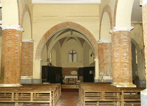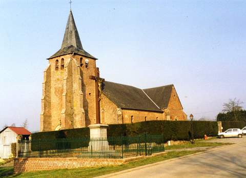 Eglise Saint Pierre. L‘Eglise de Saint Pierre-lès-Franqueville est un de ces édifices du XVIème s. typique de la Thiérache, entièrement en brique, pourvus d’éléments de défense. Elle comprend un puissant clocher occidental, épaulé par de solides contreforts d’angles à retraits nettement marqués, assez proche du clocher de l’église de Vervins. Le portail est composé d’éléments remployés en pierre du XIIème s., provenant peut-être de l’église antérieure. La nef de trois travées compte trois vaisseaux plafonnés séparés par des supports polygonaux supportant des arcs en plein cintre. L’éclairage est uniquement assuré par les baies des collatéraux. Un transept bas précède l’abside polygonale voûtée d ‘ogives. Les parties orientales de l’édifice sont ornées à l’extérieur de motifs losangés dessinés par des briques vernissées. Des meurtrières sont visibles à hauteur d’homme sur les murs de la nef et du chœur.