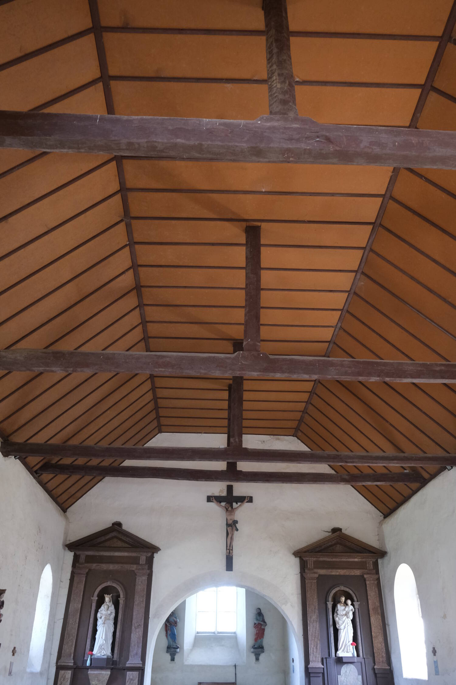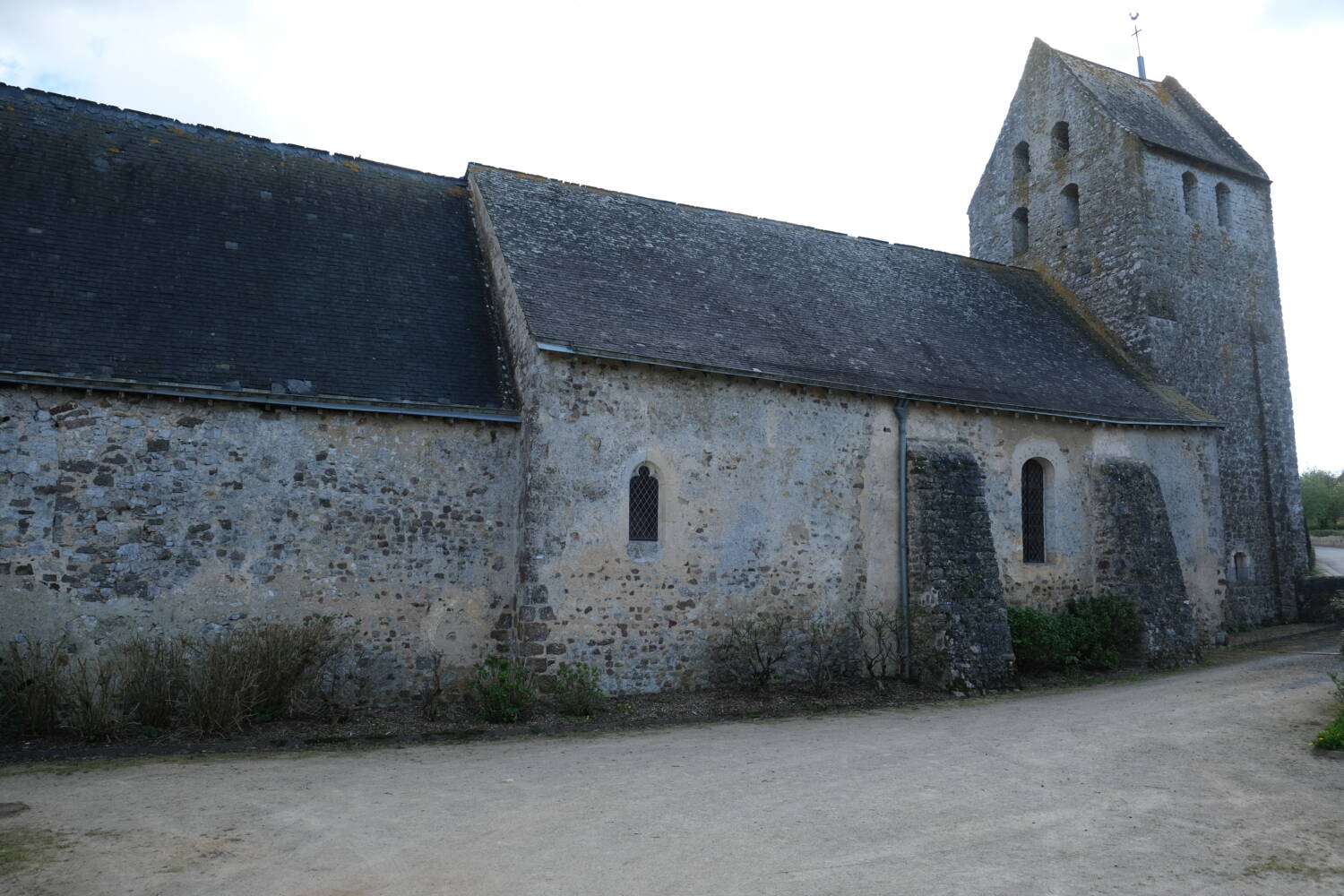 C’est une merveille de simplicité romane : arcs de plein cintre, appareillage de moellons, encadrement en grès roussard. Le volume de l’église se réduit au niveau du chœur et se termine par un chevet plat. La nef et le chœur sont couverts de toits à deux pans. La maçonnerie de la nef, dans laquelle des assises de petits moellons cubiques sont encore repérables, ainsi que la trace d’une petite fenêtre haute, murée, dans le mur nord permettent de supposer une construction au XIe siècle.