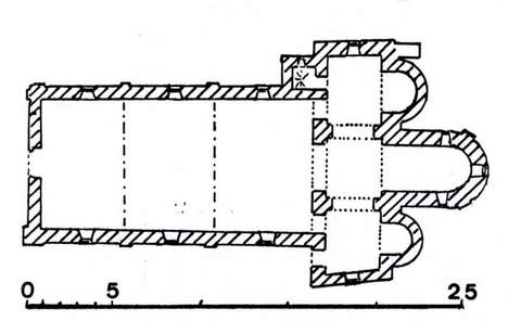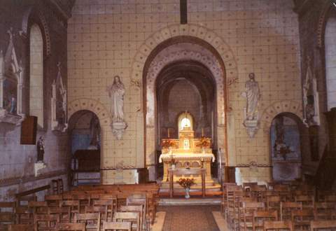 A l’intérieur, la voûte de la nef en berceau brisé a été reprise au siècle der nier sur un lambris antérieur ; certains entraits ont été conservés. Les croisillons voûtés en berceau plein cintre communiquent avec la nef par d’étroits passages latéraux, disposition ancienne intéressante qui se retrouve dans d’autres édifices de la région et dont J. Mallet a étudié la filiation ; tandis que la croisée du transept est couverte d’une coupole sur petites trompes, la travée droite du chœur est voûtée en berceau plein cintre et les absidioles ainsi que l’abside sont voûtées en cul-de-four.