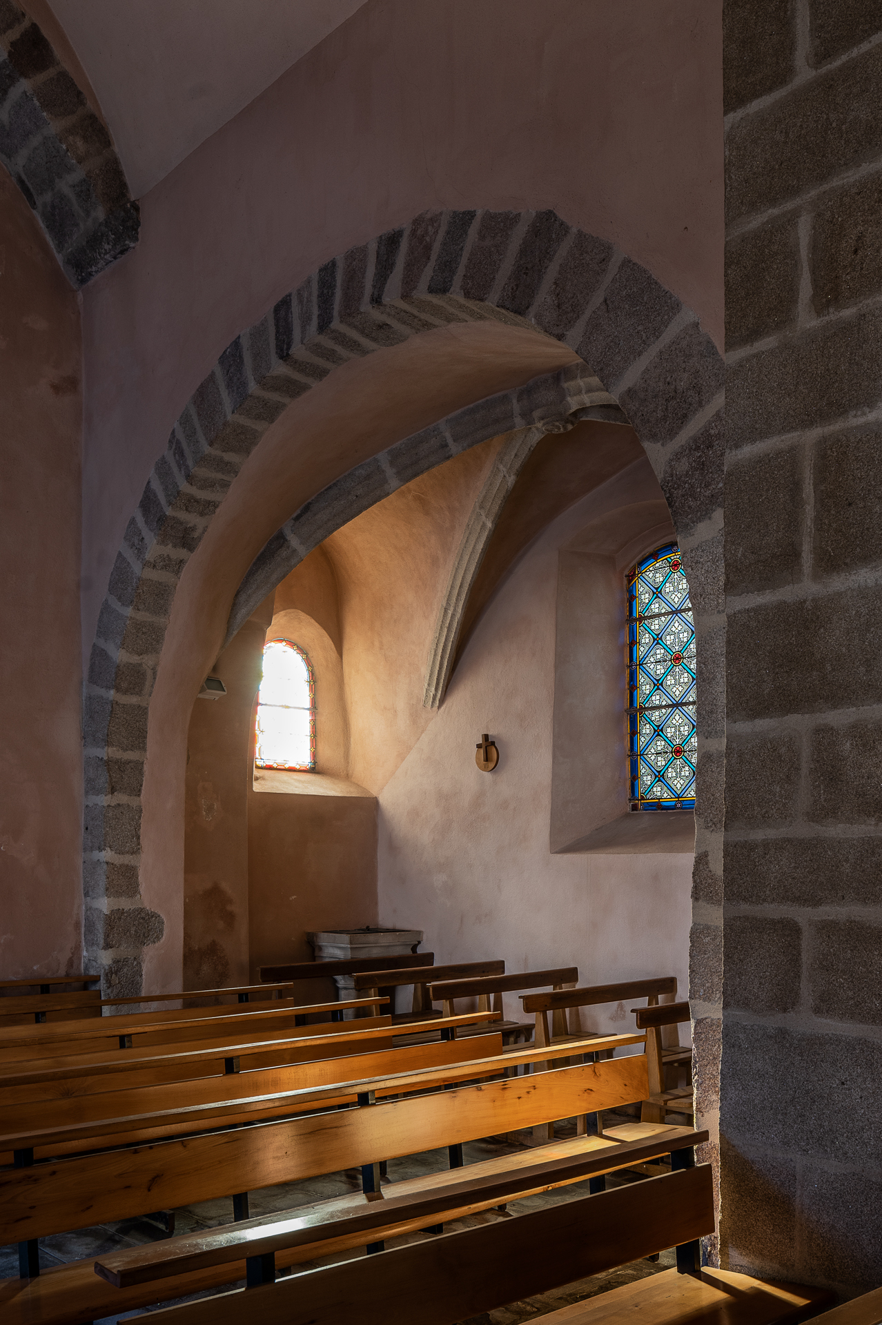 La première mention de l’église paroissiale de Saint-Romain-Lachalm figure en 1190, dans le cartulaire du prieuré de Saint-Sauveuren-Rue, placé sous la dépendance de la Chaise-Dieu de 1062 à 1401. Au cours des siècles qui suivirent , l’édifice subit de nombreuses modifications dues soit à des aménagements et à des agrandissements soit à des travaux de consolidation provoqués par des désordres structurels, ces interventions étant étroitement liées et découlant apparemment le plus souvent les unes des autres. Il semble que l’église primitive ait été constituée d’ une nef unique, probablement voûtée en berceau, avec arcatures aveugles assez basses et massives retombant sur des piles engagées supportant des arcs doubleaux. Cette nef se terminait par une abside dont la forme nous est aujourd’hui in- connue. Une prem1ere modification concerne la construction de la chapelle seigneuriale, percée dans le mur gouttereau nord-est. Elle est voûtée sur croisée d’ogives. Au XVIe s., deux autres chapelles furent construites, toujours sur le mur nord, en prolongement de la précédente. A cette période se rattache également le porche, comme l’atteste le décor à moulurations prismatiques. Par la suite et successivement, sans que l’on puisse dans l’état actuel des recherches en préciser les dates, seront ajoutés le collatéral sud et le clocher. Enfin, en phase ultime d’agrandissement, on restructura l’abside et on éleva une sacristie. Les désordres graves qui affectaient les charpentes, toitures et maçonneries, nécessitaient de très importants travaux de consolidation . La Sauvegarde de l’Art Français a accordé une subvention de 100 000 F en 1991