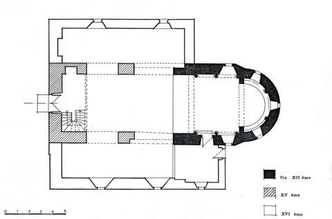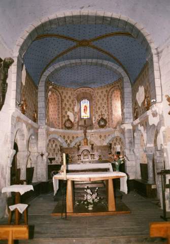 Seul exemple en Haute-Auvergne, avec sa voisine la chapelle Notre Dame du Pont à Leynhac, de construction romane en granit ru gueux du pays, l’église paroissiale de Saint-Saury possède encore un chœur et une abside du XIIe s. « Ils sont décorés d’arcatures appuyées sur les tailloirs de robustes chapiteaux couronnant des colonnettes trapues. Leur base, qui ne ressemble en rien au faire auvergnat, se com pose de trois tores égaux séparés par une gorge, celui du milieu strié d’entailles grossières formant cordelette. Deux baies remaniées en 1900 éclairent le chœur. Quant à l’abside, le jour lui vient par trois fenêtres ouvertes au-dessus de l’extrados des arcatures, à trois mètres de hauteur, au niveau de la corniche qui enserre l’ensemble ». La nef aurait été reconstruite au XVe s. et les bas-côtés ajoutés au XVIe s. La nef autrefois couverte d’un lambris a reçu, vers 1891, une voûte en brique à cintre surbaissé. Cette réfection entraîna celle de l’arc triomphal qui est également en briques. Un clocher-peigne en gros appareil de pierres rejointoyées s’élève à l’ouest. Il est percé de trois baies en plein cintre et couvert d’un toit à quatre pentes. Il a été réparé en 1745. Pour la réfection des voûtes et des maçonneries antérieures, la Sauvegarde de l’Art Français a accordé une aide de 90 000 F en 1991