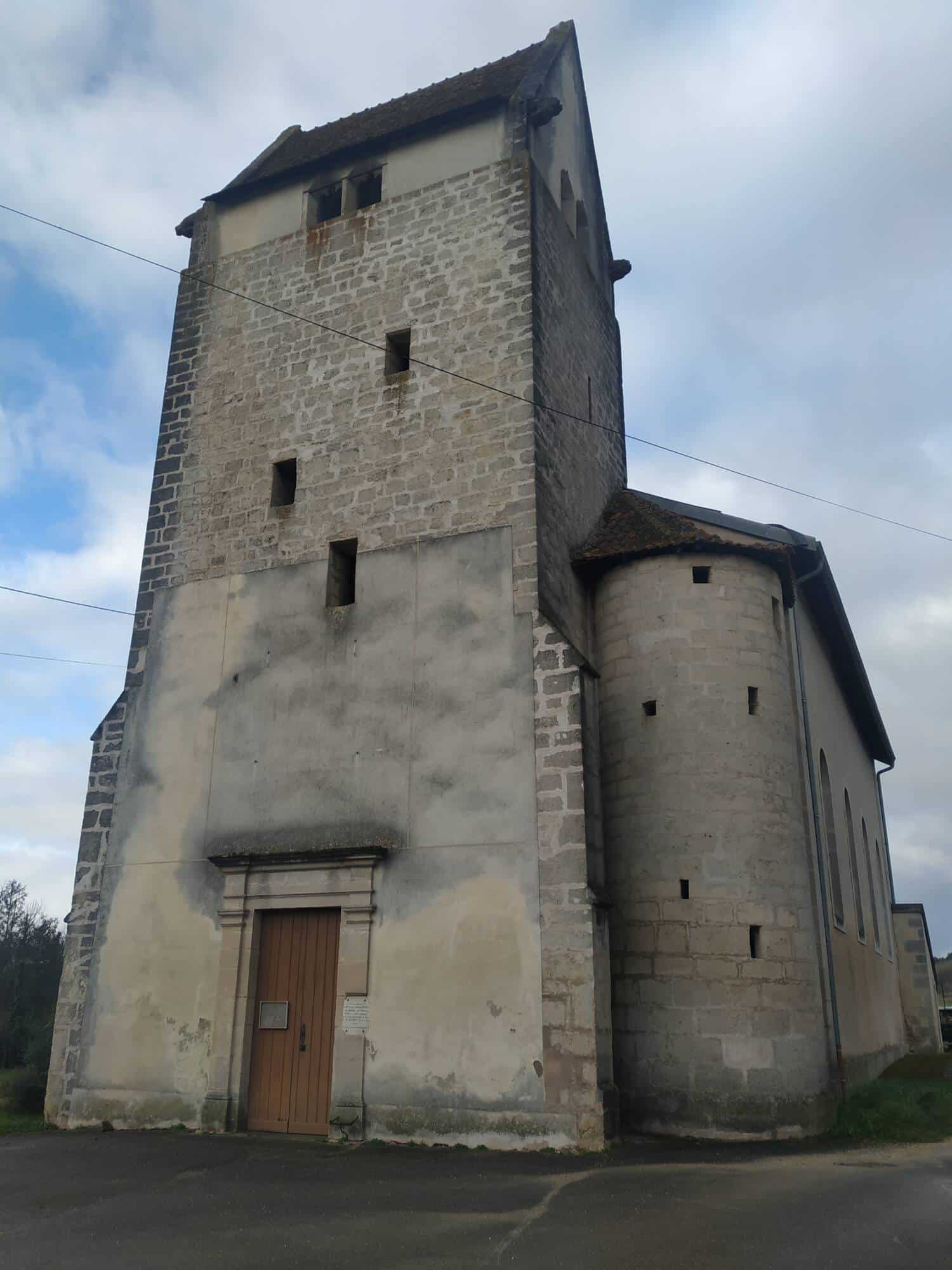L’église Saint-Sébastien d’Aulnois-sous-Vertuzey se distingue par son donjon fortifié, constituant l’élément le plus ancien de l’ensemble. Cette tour, élevée sur plusieurs niveaux de défense, est percée d’archères, de meurtrières et de fenêtres de tir, témoignant de sa fonction militaire originelle. Un accès aménagé au second niveau permettait de rejoindre une salle de refuge située au-dessus de l’église. Le clocher a été ajouté ultérieurement au sommet de cette tour, renforçant sa verticalité. L’édifice religieux, reconstruit au XVIIIe siècle, se compose de deux travées dans un style ogival. Une tourelle d’escalier, ajoutée au XVIIIe siècle, permet l’accès au clocher. L’ensemble était autrefois entouré d’un cimetière clos de murs.