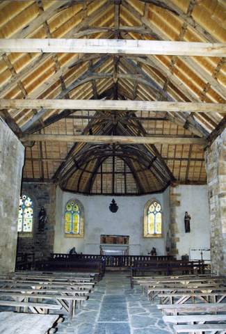 Les travaux récents n’ont pas encore permis la remise en place de la totalité du mobilier. Le maître-autel en tombeau galbé n’est plus surmonté du retable qui datait de 1781 ; le groupe de la Pietà à quatre personnages, en bois polychrome (XVIIe s.), ainsi qu’une statue de saint Étienne, revêtu de sa dalmatique de diacre, tenant d’une main la palme du martyre et de l’autre les pierres de sa lapidation, reposent sur le plancher du chœur. La chaire à prêcher a été démontée, et une partie de ses éléments sont remisés dans le bras nord du transept, où un autel est surmonté d’un grand retable du Rosaire, en bois polychrome : dans le corps central, le tableau qui représentait l’Enfant Jésus debout sur le globe du monde, a disparu – il avait lui-même succédé à une représentation du groupe du Rosaire -, mais subsistent treize médaillons sur les quinze traditionnels, et une longue inscription en breton, datant du xixe siècle : Ra zeuio en hano Jesus / Peb glin da staouet en ÂÂ / var an Douar ac en ifern / a ra zeui peb Teod da anzao / penaus on autrou Jesus Christ / a so asezet e gloar Doue an Tad (« Qu’en vienne, au nom de Jésus, / chaque genou à plier, au ciel, / sur la terre et en enfer, / et qu’en vienne chaque langue à reconnaître / comment Notre Seigneur Jésus-Christ / est assis dans la gloire de Dieu le Père ») ; de part et d’autre, des niches encadrées de colonnes torses à pampres abritent, à gauche un groupe de sainte Anne et de la Vierge portant l’Enfant Jésus, à droite un groupe de saint Yves entre le Riche et le Pauvre (groupe qui, à l’origine, ne figurait probablement pas dans ce retable, puisqu’on peut lire sous la niche le nom de Joseph) ; chacune de ces niches est elle-même surmontée d’une niche plus petite servant de cadre à des statuettes d’évêques non identifiés.