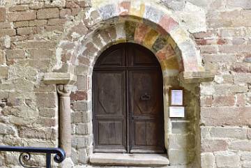 Sur cette même façade, s’ouvre un portail roman, qui donne accès à l’intérieur de l’église, et se compose d’un arc plein-cintre qui retombe sur des colonnes à chapiteaux sculptés. Des traces de polychromie datant de la fin du Moyen Age sont encore visibles et délimitent des faux claveaux noirs, rouges et jaunes.
