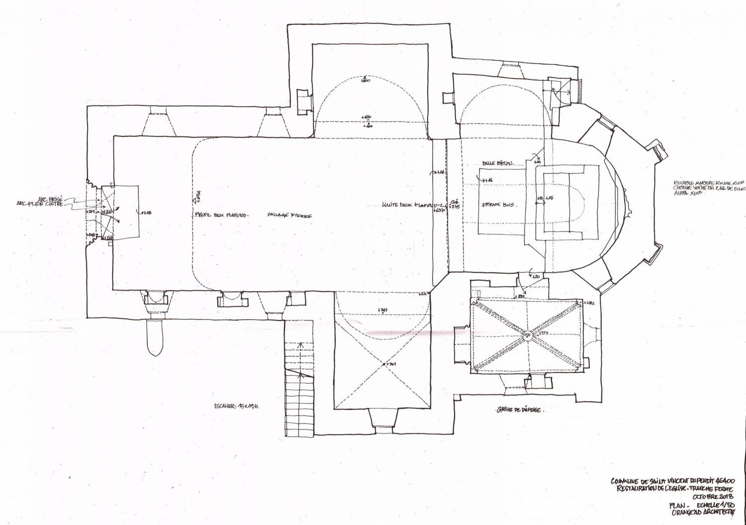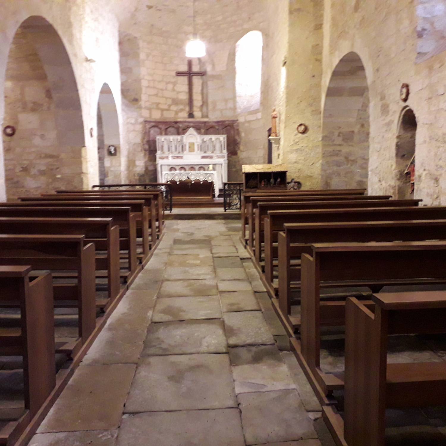 Les baies latérales ont été modifiées, vraisemblablement lors de la mise en place d’un retable en marbre rouge du XVIIème siècle, dont il subsiste la base autour de l’abside.