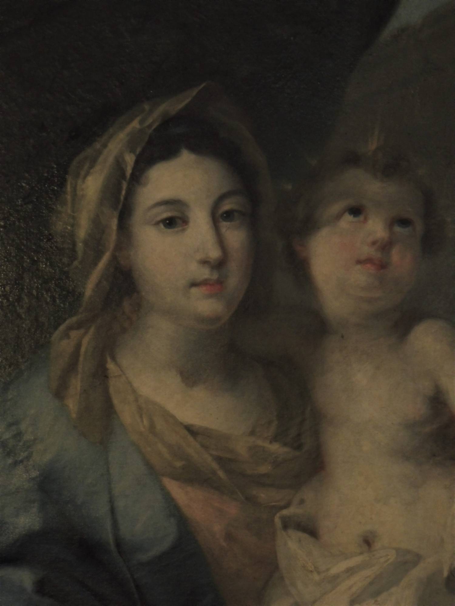 Si le peintre représente une fameuse scène biblique conformément aux codes du temps, il s’y emploie de manière virtuose. En effet, le tableau est remarquable par sa qualité technique, notamment dans les visages de Marie et Jésus. Comme l’a remarqué Guillaume Kazerouni[1], ces éléments permettent de rapprocher l’œuvre de la production de Pierre Mignard, l’un des plus grands artistes du XVIIème siècle, ayant reçu la charge de Premier Peintre de Louis XIV.