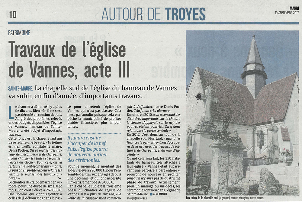 L’édifice était à l’origine une chapelle, devenu église paroissiale au XVIème après agrandissement. Il laisse apparaître un chevet dans son état d’origine pour les maçonnerie XII ème. Au XVI ème évolution de la construction avec l’ajout de 2 transepts et la réalisation d’une charpente à chevrons fermes. Le plan est en forme de croix latine sur un élément du XII ème, devenu aujourd’hui chevet et croisée de transept. ces transepts sont voutés. La nef, reprise au niveau des maçonneries au XII ème et XVI ème a été très modifiée au XIX ème. Sur les combles du transept s’élevait une flèche en bois de belles proportions, environ 30 mètres, abattue par un ouragan en mai 1967 alors qu’elle était en cours de restauration. Elle fût rétablie dans des dimensions plus modestes. Les voutes de la nef comme celle de la chapelle et du sanctuaire sont en bois. La tradition rapporte qu’en sortant de Troyes, Saint Thomas de Cantorbéry de rendit à vannes pour consacrer cette église.