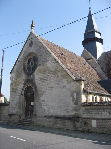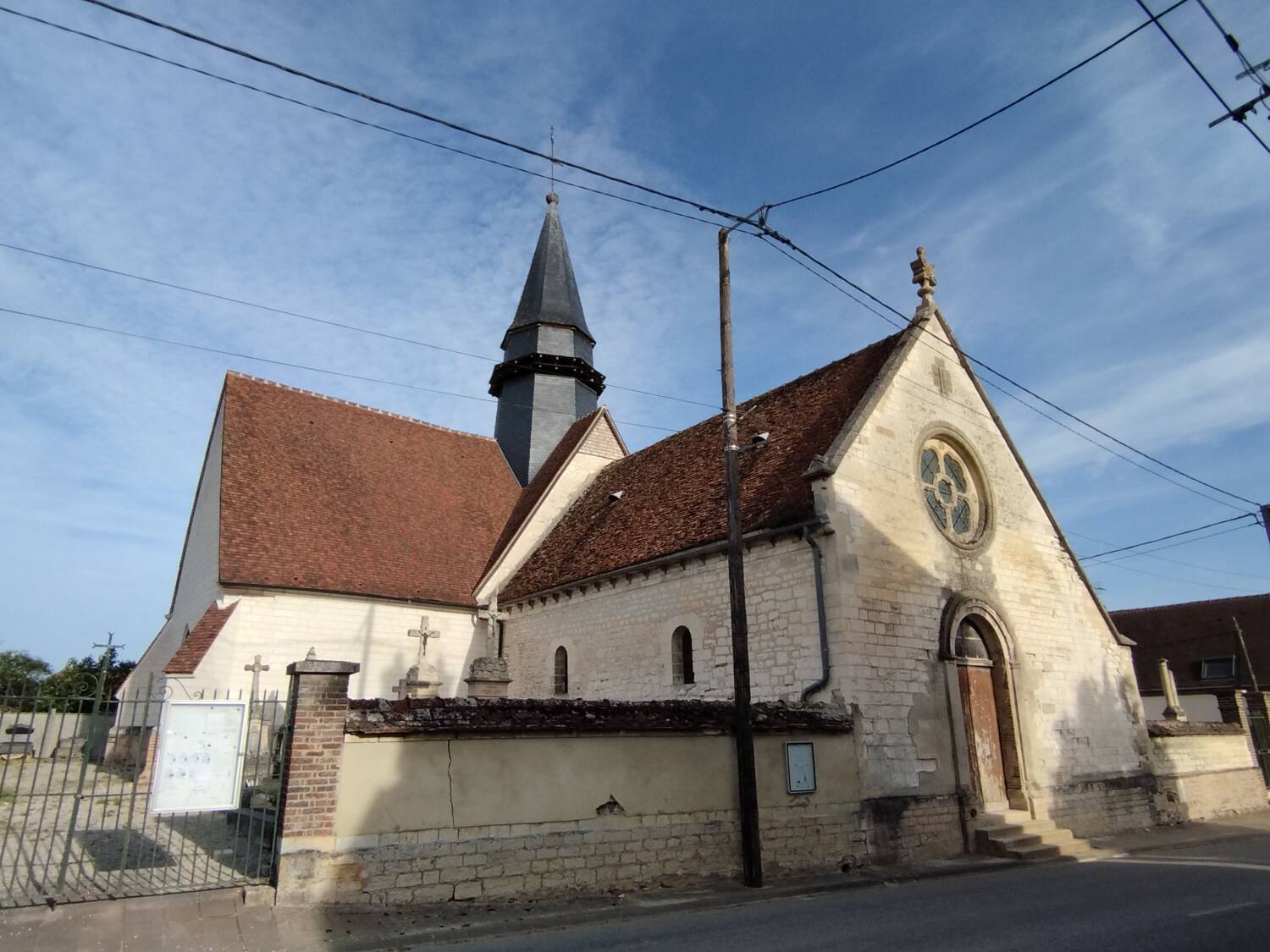 Toute cette partie de la façade a été rétablie, en 1875, par Victor Morisel, architecte à Troyes. Une flèche en bois, d’une assez belle proportion et couverte en ardoise, s’élève sur les combles du transept.