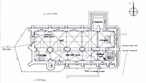 « Elle comprenait, à l’origine, une nef de trois travées suivie d’un chœur à chevet plat de deux travées, et une chapelle au midi.