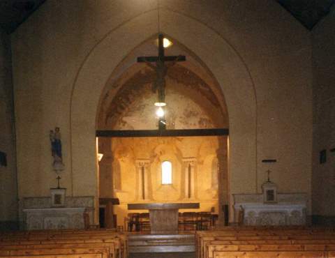 Église Saint-Priest. L’église de Sandrans, citée dès le Xe s., fut donnée, vers 1105, au chapitre primatial de Lyon par l’archevêque Hugues, sans doute après un détournement momentané. Vers 1080, cette paroisse était déjà le siège d’un archiprêtré. Les archevêques de Lyon conservèrent le patronage jusqu’en 1530, époque où elle fut unie au nouveau chapitre canonial de Montluel. Lors de la visite pastorale de 1656, cette église possédait deux autels secondaires, dans la nef: l’un, côté épître (au sud), dédié à sainte Catherine, et l’autre, côté évangile, à saint Jacques, « fondé autrefois de 150 livres de revenus » ; le patronage de ce dernier appartenait aux Saint-Amour, seigneurs du lieu. Toute l’église était alors en « fort bon estat, estant claire, propre, lambrissée et carrelée partout ». Le clocher s’élevait au-dessus de la travée de chœur. On signalait un beau bénitier et une grande croix en pierre. Le long des murs de la nef, s’alignaient de nombreux coffres mis là en sûreté « à cause des logements fréquents des troupes ». La façade, d’implantation romane, a été partiellement refaite en 1888, mais le portail, avec ses colonnettes, ses chapiteaux et son tympan nu entouré de palmettes, a été remployé en grande partie. Vers 1880, la nef a vu ses murs surélevés et ses ouvertures refaites. La charpente apparente fut habillée par un plafond, en remplacement d’un lambris plus ancien. La travée de chœur a gardé sa coupole sur trompe romane, mais les arcs latéraux et leurs piédroits ont été noyés dans les maçonneries nécessitées pour renforcer l’assise de la tour du clocher, en 1906. L’abside a été dégagée, à l’extérieur, vers 1970, de bâtiments parasites qui la défiguraient. La fenêtre centrale est décorée de colonnettes. À l’intérieur, elle est décorée d’une arcature de cinq travées dont deux sont aveugles et un peu plus étroites. Les colon- nettes et les chapiteaux des arcs sont jumelés pour porter un même tailloir. Ces chapiteaux sont décorés de motifs végétaux, de têtes d’où s’échappent des feuilles, et de monstres à queue en spirale. Les pilastres sont aussi remarquables. Sur l’un on reconnaît, dans les personnages filiformes, Adam et Ève, tandis que sur un . autre, un personnage, armé d’une sorte de massue et d’une pierre, à la jambe dévorée par un immense serpent écailleux. Le clocher, qui s’élève sur la travée de chœur, a été arasé sous la Révolution et remonté en 1826. La restauration récente a fait apparaître, à l’extérieur, une porte dans le mur sud de la nef. Son linteau est curieusement percé d’une petite ouverture carrée qui communique avec l’intérieur. Malgré les remaniements que cette église a subis, surtout au XIXe s., elle reste un des beaux spécimens de l’architecture romane de la Dombes. Parmi le mobilier, à signaler les statues de saint Martin et de saint Prix (Priest) (XVIIe s. ?). Vers la chaire, petite crédence du XIVe siècle. Anciens fonts baptismaux octogones en pierre. La Sauvegarde de l’Art français a accordé 100 000 F en 1999 pour la réfection des maçonneries, de la charpente et de la couverture de la nef. L’intérieur, qui a longtemps pâti du mauvais état des toitures et de l’humidité, attend une prochaine restauration.
