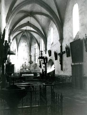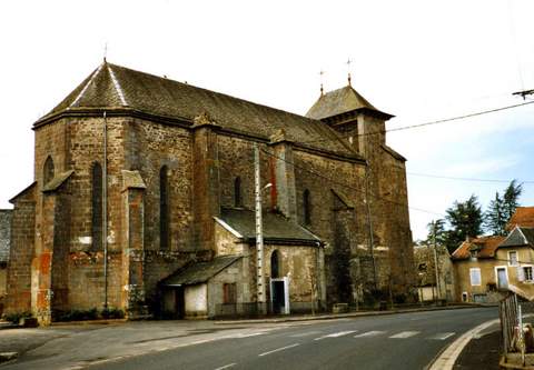 L’église est placée sous le vocable de saint Eutrope, qui serait l’évêque de Saintes, martyr du iiie s. L’existence d’un édifice est connue dès 923. Dévastée par les révoltes paysannes de 1295 qui ruinèrent la haute vallée de la Cère, puis anéantie par les bandes anglo-gasconnes de la fin de la guerre de Cent Ans, l’église actuelle a été construite au début du xve s., au même emplacement semble-t-il.L’édifice de 19 m de long a été apparemment construit d’un seul jet ; son plan en forme de croix latine comportant trois travées et un chœur barlong prolongé par une abside à trois pans n’a pas subi de modifications avant le xixe s. À partir de 1850, la face nord fut dégagée par le tracé de la route nationale 122 et une sacristie construite. Un important clocher mur qui pouvait abriter quatre cloches surmonte le pignon ouest. La Sauvegarde de l’Art français a participé en 1987, pour 60 000 F, à la révision de la toiture en lauzes et à diverses réparations de gros œuvre.