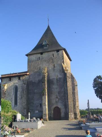 L’église est construite à proximité de deux fontaines, consacrées l’une à saint Roch et l’autre à la Vierge. Elle se compose d’une nef unique terminée par un chevet, arrondi à l’extérieur, à pans à l’intérieur ; le chœur n’est pas dans le même axe que la nef. Une chapelle s’ouvre sur la travée orientale de celle-ci. À l’ouest, l’édifice est précédé d’une grosse tour dont la silhouette massive apparaît plus comme un élément de défense que comme un clocher d’église ; elle est flanquée d’une tourelle circulaire abritant un escalier. Ce clocher qui pourrait dater du XVe s. dut servir de refuge lors des troubles, nombreux au XVIe s. dans la vicomté. Sous la tour occidentale s’ouvre un portail de pierre, en arc brisé, du XIVe ou XVe siècle : il est encadré de trois ressauts, soulignés par des tores, qui reposent sur des colonnettes, par l’intermédiaire de chapiteaux à feuillage. Leurs bases sont sculptées. L’abside polygonale comporte un réduit fortifié situé au-dessus de la voûte sexpartite ; elle est percée dans son axe médian d’une fenêtre meurtrière. Quelques corbeaux demeurent visibles dans la partie haute du chevet, témoins d’un probable passage ; des « mirandes », comme à Saint-Sernin de Toulouse, ont été ouvertes sous la toiture. La modeste chapelle, construite au sud, est plus tardive, elle semble dater du XVIIe ou du XVIIIe siècle.