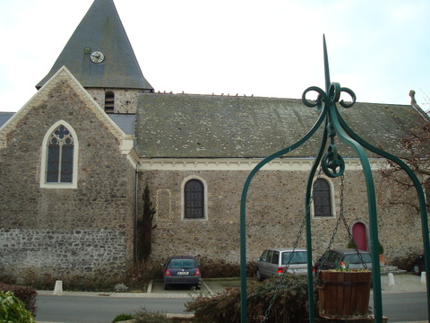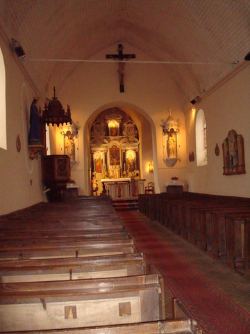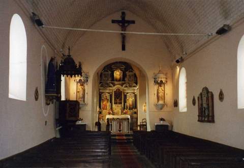 À l’intérieur, si l’église témoigne d’importantes campagnes de travaux qui nuisent à sa lisibilité, elle renferme, en revanche, comme sa voisine, un mobilier d’une richesse remarquable. Le mur du chevet est occupé par un magnifique retable de type lavallois qui développe sa riche architecture à deux registres et son décor de colonnes à fûts monolithes de marbre noir et à chapiteaux corinthiens, de frontons à volutes, de pots à feu et de couronnes de fruits pour exalter le tableau du maître-autel, le Couronnement de la Vierge. On remarquera comment les artistes ont su exploiter l’espace très étroit du chœur en développant un retable à pans coupés – œuvre de Michel II Lemesle d’après les dessins de François Langlois, 1689 -. Cependant l’église renferme d’autres œuvres d’un grand intérêt, une statue de la Trinité (XVe s.) et la prédelle d’un retable du tout début du XVe s. représentant une Crucifixion avec de part et d’autres les donateurs agenouillés.