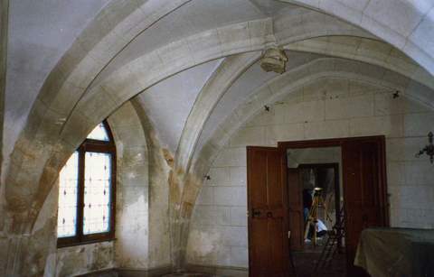 Le prieuré de Sauxillanges dont l’origine remonte à Guillaume, duc d’Aquitaine, fut au Xe s. l’un des plus importants de Cluny. Vendu à la Révolution, démantelé, en grande partie détruit, il en subsiste une chapelle qui jouxtait autrefois le cloître du côté sud, la grande église monastique sur le côté nord a disparu. Cette chapelle dédiée à Notre-Dame des Bois a été transformée en maison d’habitation au XIXe s., le volume de la nef étant alors partagé en deux dans le sens horizontal par l’adjonction d’un plancher. Un étage fut également ajouté et les fenêtres transformées. L’Association Pierre le Vénérable, qui a pris en charge ce monument, s’est d’abord investie à réparer la toiture, démolir les structures parasites et nettoyer les murs, voûtes et sous-sol afin de lui redonner son volume et sa fonction originale. Cette chapelle est de plan rectangulaire orienté formé d’une seule nef de quatre travées et d’un chœur avec abside pentagonale. À l’examen des piliers, une différence de niveau apparaît entre le chœur et l’abside. Le voûtement sur croisées d’ogives est orné de belles clés sculptées et polychromes qui représentent des anges et des animaux portant des écus aux armes de France, de Cluny et de certains des anciens prieurs. Les arcs sont à section semi-octogonale avec un profil à cavets. Ils retombent sur des piliers cylindriques. Les doubleaux qui confortent la voûte sont en arc brisé et pénètrent des supports engagés. Les fenêtres en tiers-point ont certainement été élargies au XVIIIe s. et raccourcies récemment pour l’usage domestique. Le portail d’origine situé à l’ouest a été comblé par de la maçonnerie. L’entrée actuelle se fait par une ancienne fenêtre gothique à remplage flamboyant. Ce bâtiment est inscrit à l’Inventaire supplémentaire des Monuments historiques. La première tranche des travaux porte sur la remise en état de la voûte du chœur. La Sauvegarde de l’Art Français a versé 20 000 F en 1993.