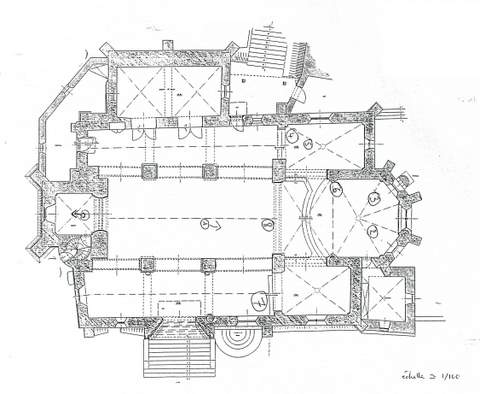 La nef est romane, rythmée par de puissants piliers carrés qui supportent, sur l’étendue de ses trois travées, une voûte en berceau légèrement brisé, terminée aux deux extrémités par un arc de même profil. De nombreuses additions des XIVème et XVème s., donnent à l’ensemble de l’édifice une allure gothique.