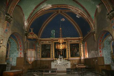 Une pierre inscrite au-dessus de l’arc de la porte date la construction de 1660, construction qui dut modifier si sensiblement les pratiques locales qu’un procès s’engagea bientôt, entre le seigneur du lieu et la communauté, pour la possession de l’édifice. La chapelle forme un ensemble avec l’ancien presbytère, vaste maison construite en retour d’équerre par rapport à la chapelle, sans doute vers la même époque. C’est un édifice assez vaste, conçu pour accueillir la foule, sobrement rectangulaire (quinze mètres par sept), avec deux petites chapelles carrées formant faux transept au nord et au sud, et chevet plat. Elle ne comprend pratiquement aucune modénature ni décor extérieur, et l’intérieur lui-même est fort simple. Seul accent particulier: un petit clocher-mur d’une arcade domine la façade, avec une cloche.