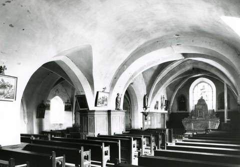 Église paroissiale Saint-Gal. Dossier présenté par M. le chanoine Marilier, délégué régional de notre association. Malgré le très petit nombre d’habitants que compte la commune, une souscription locale a produit la somme de 10 000 F. Cette somme est néanmoins insuffisante pour refaire la majeure partie des toitures d’un édifice datant du xve siècle ou du début du siècle suivant, dont le plan et la structure aux voûtes puissantes se recommandent à l’attention des archéologues. Le mobilier qui comporte un riche autel de marbre du xviiie siècle, une très belle statue de jeune martyre remontant au xve siècle, ainsi que les statues plus récentes de saint Gall et de saint Claude – abbés colombanistes rarement représentés –, ne manque pas non plus d’intérêt. Les culots sur lesquels retombent les arcs des voûtes sont moulurés ou sculptés de masques assez expressifs. Cette église du temps de la guerre de Cent ans mériterait d’autant plus d’être inscrite à l’inventaire supplémentaire des Monuments historiques qu’elle est encore entourée de son cimetière. À l’extérieur, un cadran solaire surmonte la fenêtre de la chapelle sud. Il porte, gravée, l’invocation « Jésus Maria » avec la date de 1619. Le clocher a été entièrement reconstruit en 1861, mais la silhouette de l’église n’en est pas altérée. Un tel édifice mérite d’être soigneusement conservé. Une subvention de la Sauvegarde de l’Art français de 20 000 F nous a semblé s’imposer d’autant plus que la commune, comme je l’ai déjà fait remarquer, ne compte qu’un très petit nombre d’habitants.