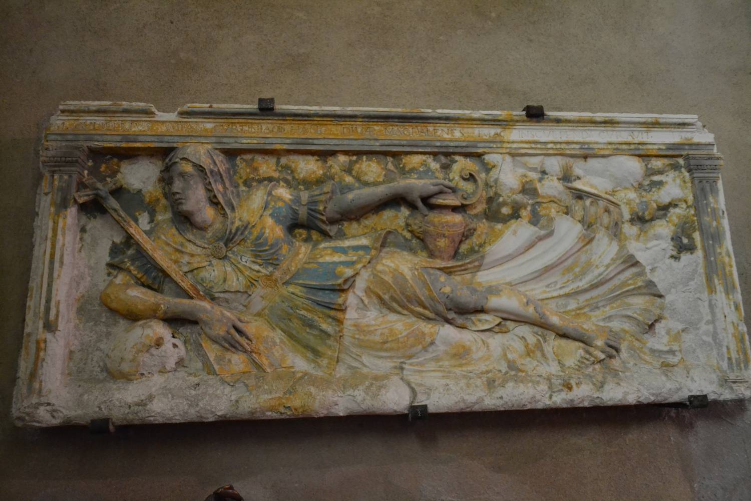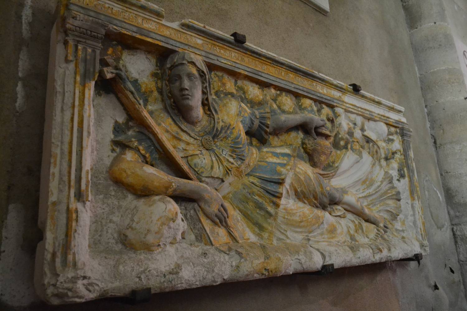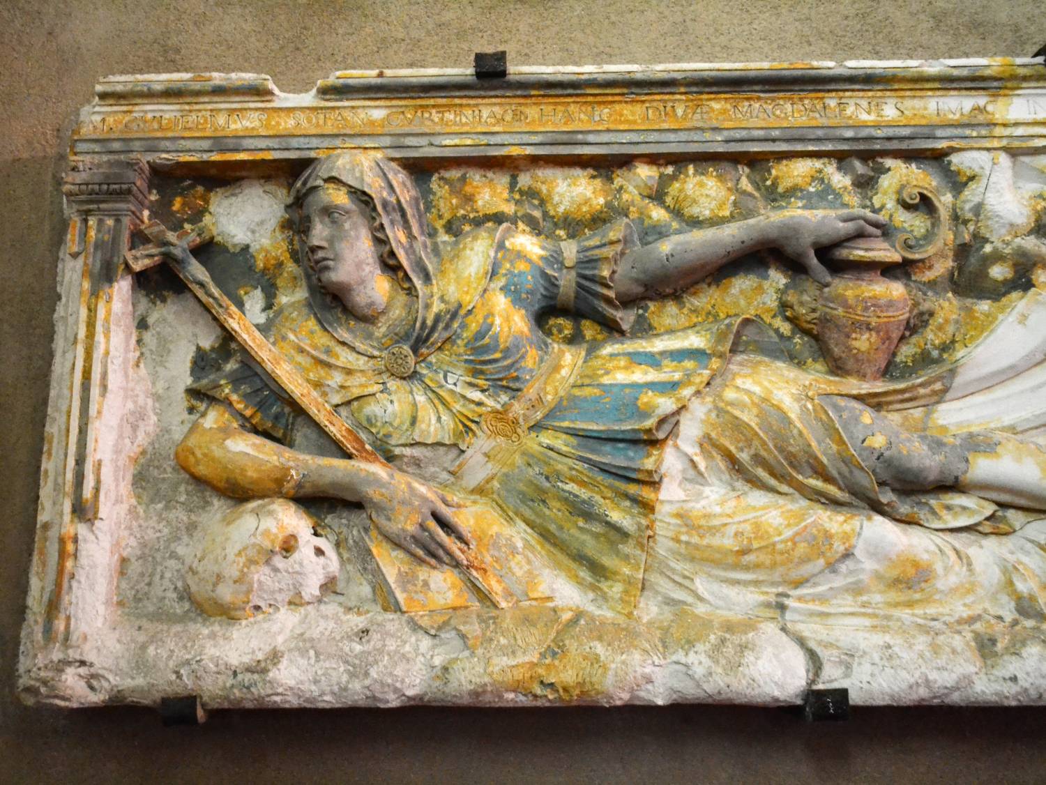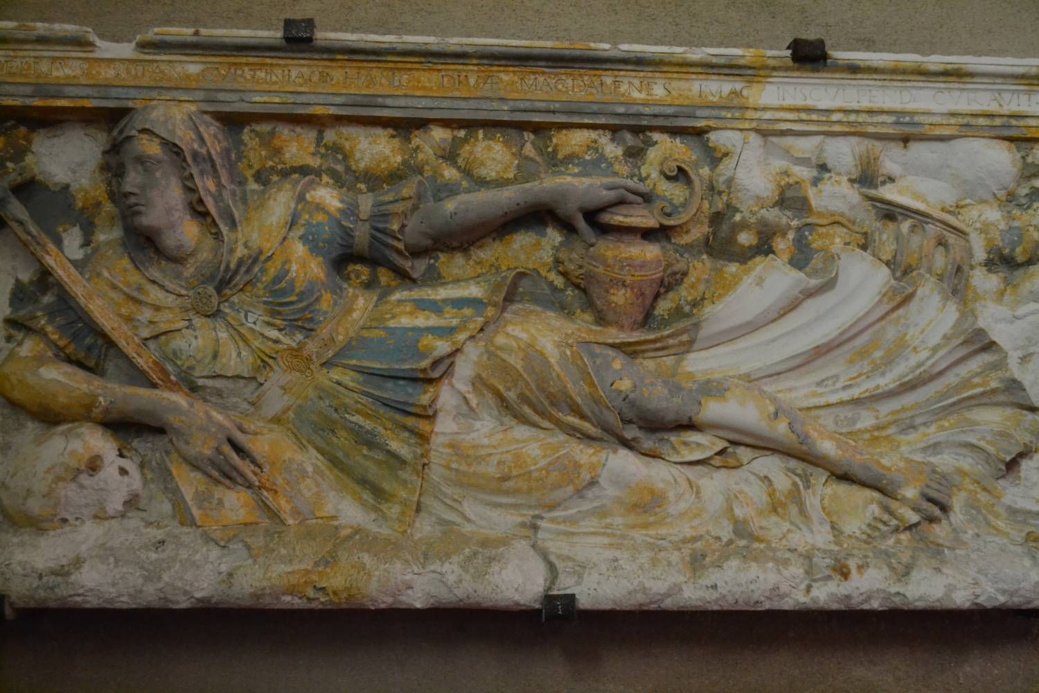 L’inscription en latin, encore bien visible, sur la partie haute du bas-relief atteste de l’identité du commanditaire ainsi que de l’année de sa création: « M. GVLIELMUS SOTAN CVRTINIACEN. HANC DIVAE MAGDALENES IMAGO INSCULPENDA CURAVIT 1567. »