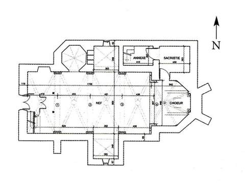 L’édifice se compose d’une nef unique de quatre travées, voûtée en berceau surbaissé et terminée par un chevet polygonal. Deux chapelles s’ouvrent sur la troisième travée, l’une au nord, l’autre au sud. Une autre chapelle, la chapelle des fonts, de plan octogonal, peut être la base d’un ancien clocher. La sacristie est bâtie dans le prolongement de ces deux chapelles et ouvre sur le côté nord du chœur.