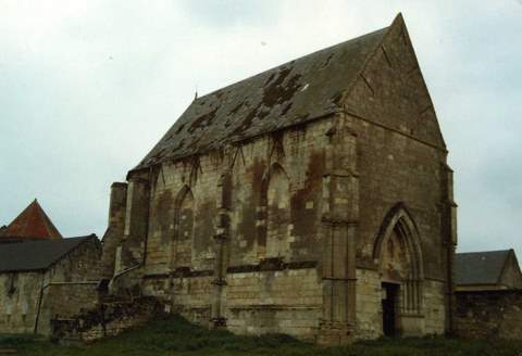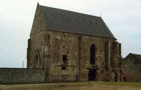 La chapelle présente aujourd’hui un plan très simple, puisqu’elle se compose d’une nef de deux travées et d’un chevet à sept pans.Ce plan résulte en réalité d’un réaménagement à la fin du xve s. de l’édifice primitif du xiiie s., en grande partie ruiné pendant la guerre de Cent Ans. La disposition originale, restituée par B. Ancien, montrait une nef accompagnée de deux collatéraux d’au moins deux travées, un transept saillant, une travée droite de chœur accompagnée elle aussi de collatéraux et l’abside toujours visible, quoique remaniée dans sa partie supérieure. Après la reconstruction du xve s., les colonnes cantonnées de colonnettes qui soutenaient la croisée du transept délimitèrent avec le chevet le nouveau tracé de la chapelle désormais bien réduite. Enfin, le portail du xiiie s. fut heureusement conservé et remployé sur la nouvelle façade.