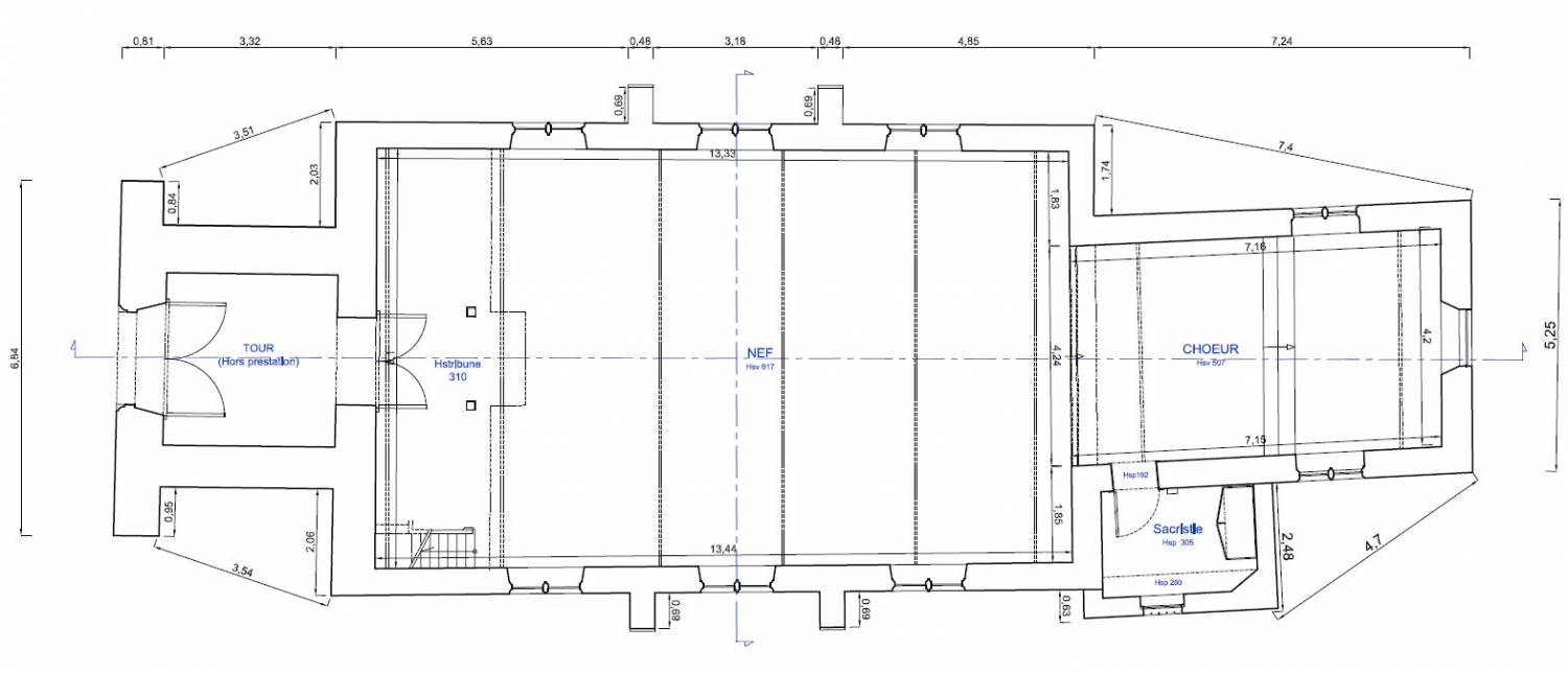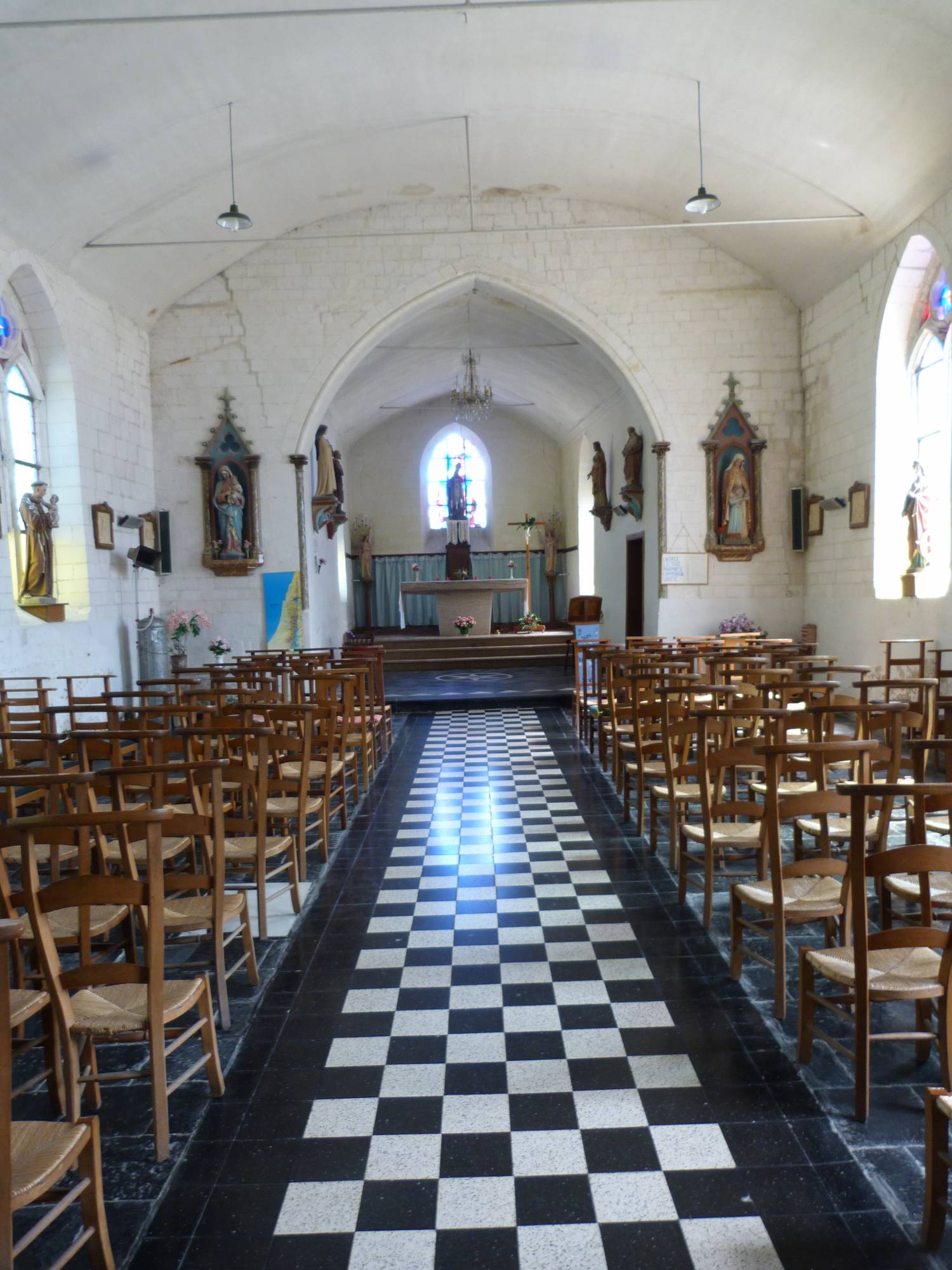Démolie en 1863, la nef a été reconstruite sur ses fondations par un simple maçon local. Elle est couverte d’ une voûte plâtrée, sur armature de bois, au profil très tendu. Quant au chœur, il conserve des maçonneries du XVIIIe siècle, réutilisées lors des travaux du XIXe siècle.