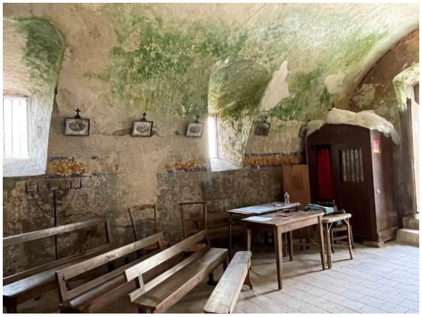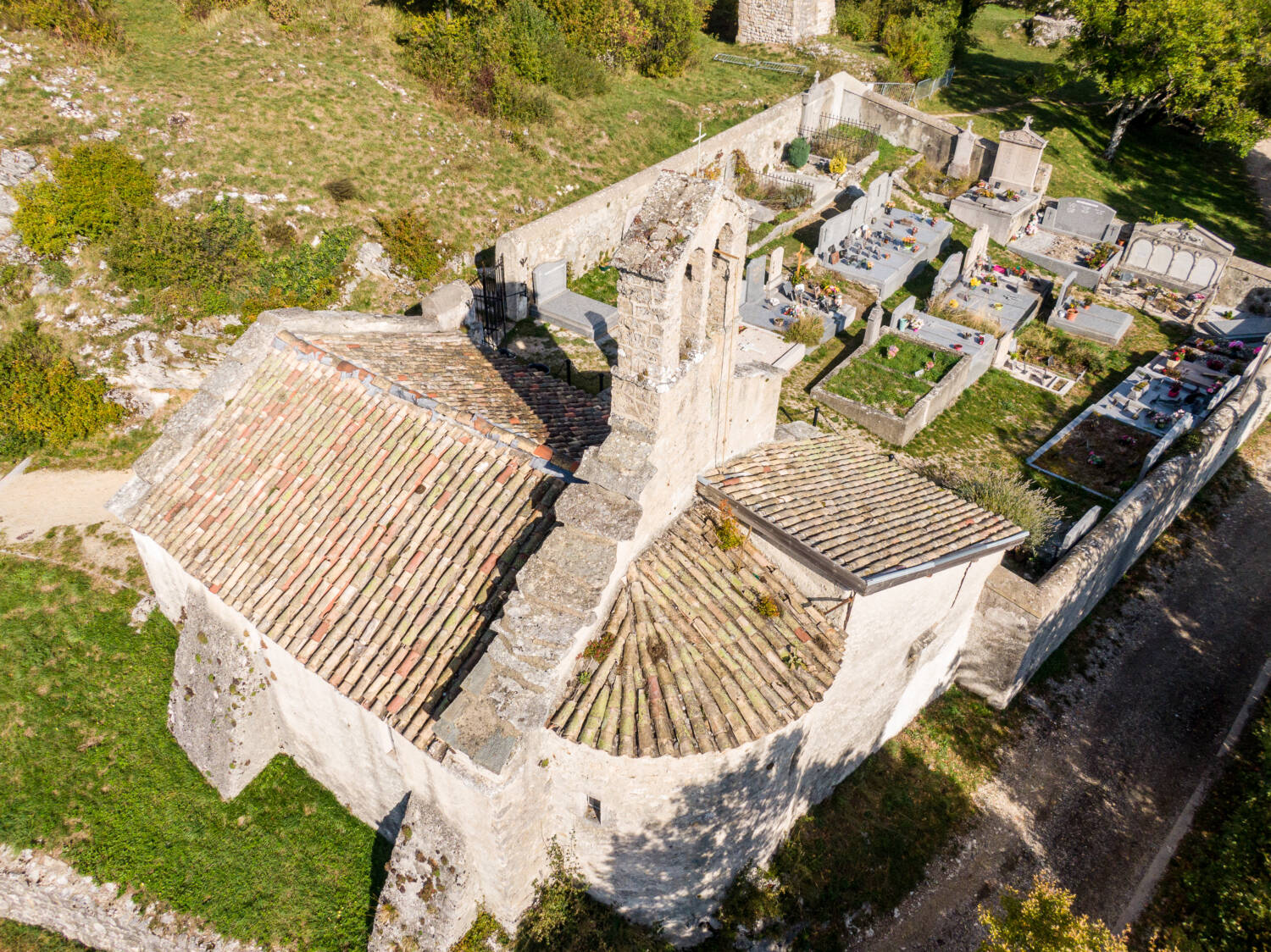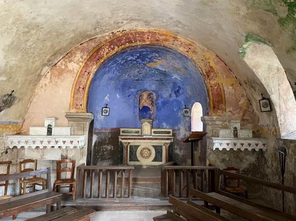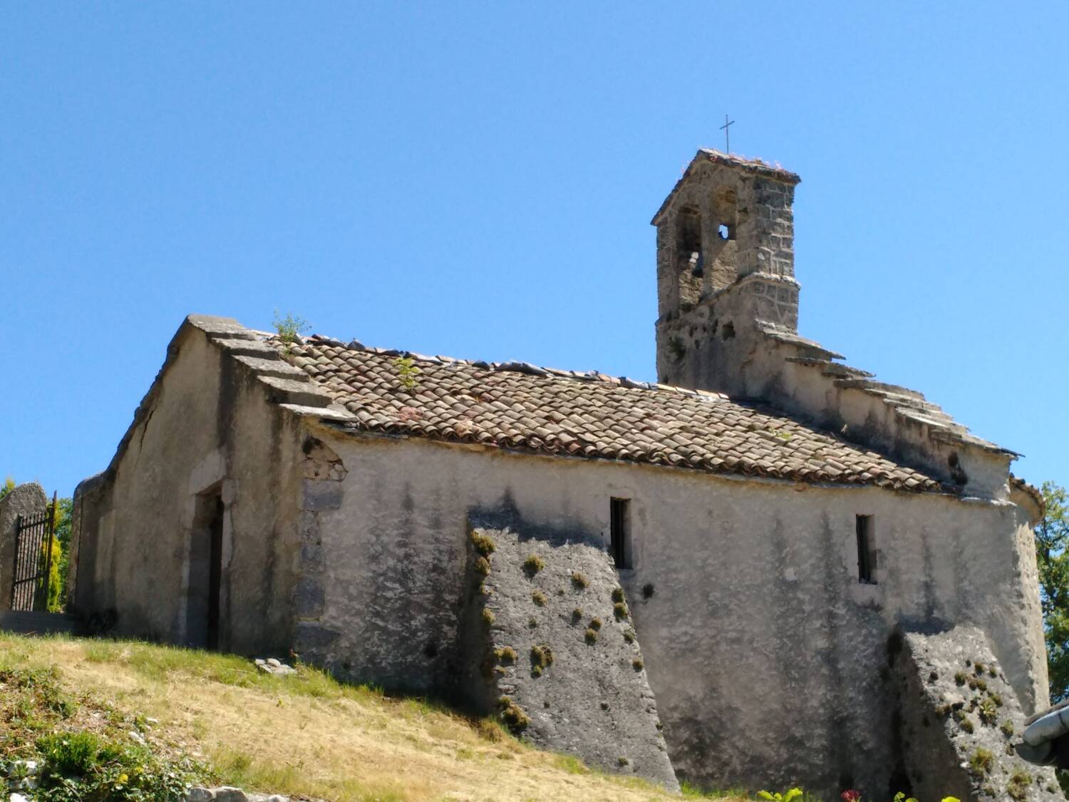 Si une visite de 1673 mentionne un bâtiment « éloigné de tout », l’étude du site castral révèle que la chapelle se situait à proximité de l’ancien porche d’entrée, probablement adossée à l’extérieur de l’enceinte fortifiée. Cette même année, l’évêque en visite exige le remplacement de la toiture en lauzes, jugée trop lourde pour la voûte en pierre, par une couverture en tuiles. Des traces de cette couverture primitive subsistent encore en arase des murs gouttereaux et dans les combles de la sacristie. La cloche, datée de 1654, a été classée Monument historique en 1963.
