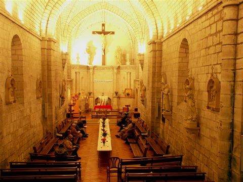La nef, voûtée en berceau brisé, est soutenue en son centre par un arc doubleau reposant sur de grosses colonnes engagées. Dans la travée sous clocher et le chevet carré, les voûtes sur croisées d’ogives, pourvues de liernes, semblent d’origine. La fenêtre orientale du chevet, en plein cintre et dans laquelle on a voulu voir, probablement à tort, les vestiges d’un triplet, a été murée, probablement lors de l’installation, à l’intérieur, d’un grand et beau retable en pierre blanche, jadis rehaussé de dorure et ordonné autour de quatre colonnes corinthiennes cannelées, placées sur un stylobate élevé. Cet ensemble, fâcheusement mutilé dans sa partie centrale par l’enlèvement de l’autel, semble dater du XVIIe siècle. Neuf verrières, dues à l’atelier Dagrand de Bordeaux, garnissent les baies du chœur et de la nef qui, au moins pour l’essentiel, paraissent d’origine.
