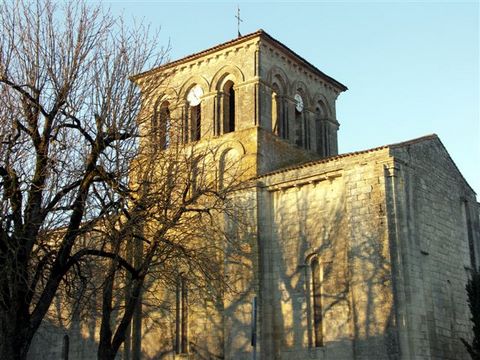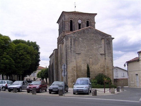 L’élément le plus remarquable de cette église aux formes massives, est incontestablement le clocher de plan carré, avec, sur chaque face, quatre baies aveugles au niveau inférieur et trois baies ouvertes à l’étage supérieur, couronné d’une corniche à petits modillons. Le portail occidental, singulièrement sobre par comparaison avec la plupart des portails saintongeais, comporte trois voussures nues, entourées à bonne distance et de façon tout à fait inhabituelle, par un grand arc de décharge, peu saillant, qui laisse autour de la voussure la plus extérieure une large zone dégagée. Selon un dispositif relativement rare dans le contexte régional, l’ensemble s’inscrit dans une surépaisseur rectangulaire qui occupe à peu près la moitié de la partie inférieure de la façade ; elle est surmontée d’une fenêtre, très haute et très étroite. L’ensemble des maçonneries de la partie occidentale de l’édifice porte des traces de remaniements et de réfections d’interprétation difficile. L’église a, en effet, fait l’objet, en 1877 puis en 1888, de deux campagnes de travaux, menées par deux architectes de Jarnac, Fouche et Priollaud, mais l’étendue de leurs interventions ne semble pas connue avec précision.
