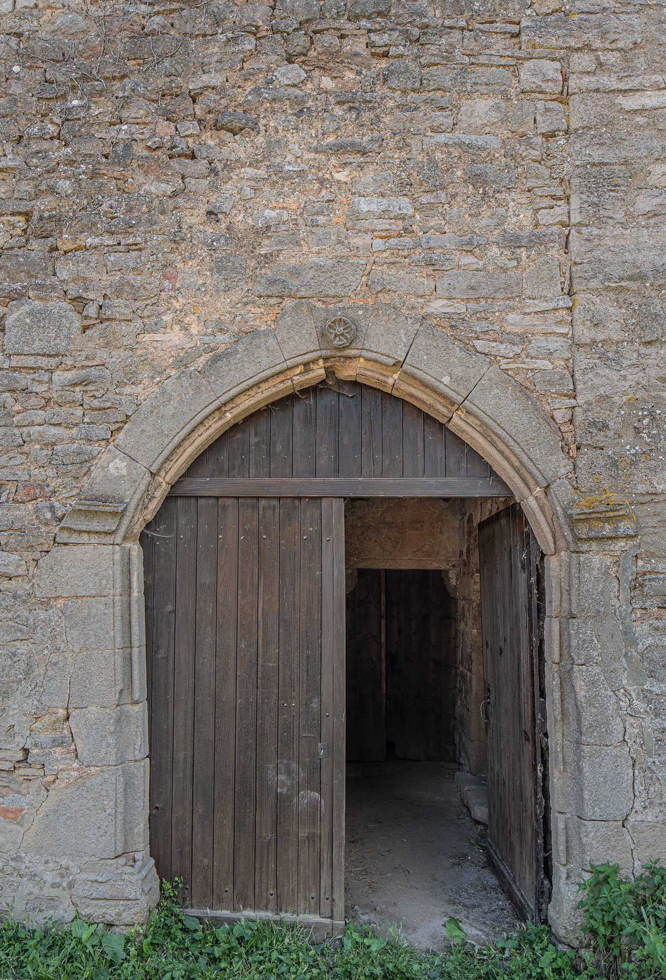 L’édifice, bâti en pierres de taille enduites, est couvert d’un toit à deux versants aux tuiles en écailles, refait à l’identique. La porte d’accès de la nef est couverte par un tympan monolithe, en calcaire rose, supporté par des coussinets au décor figuré ; il est gravé d’une croix prise dans un cercle, d’un oiseau et d’une figure difficile à identifier, entre une chimère ou une croix.