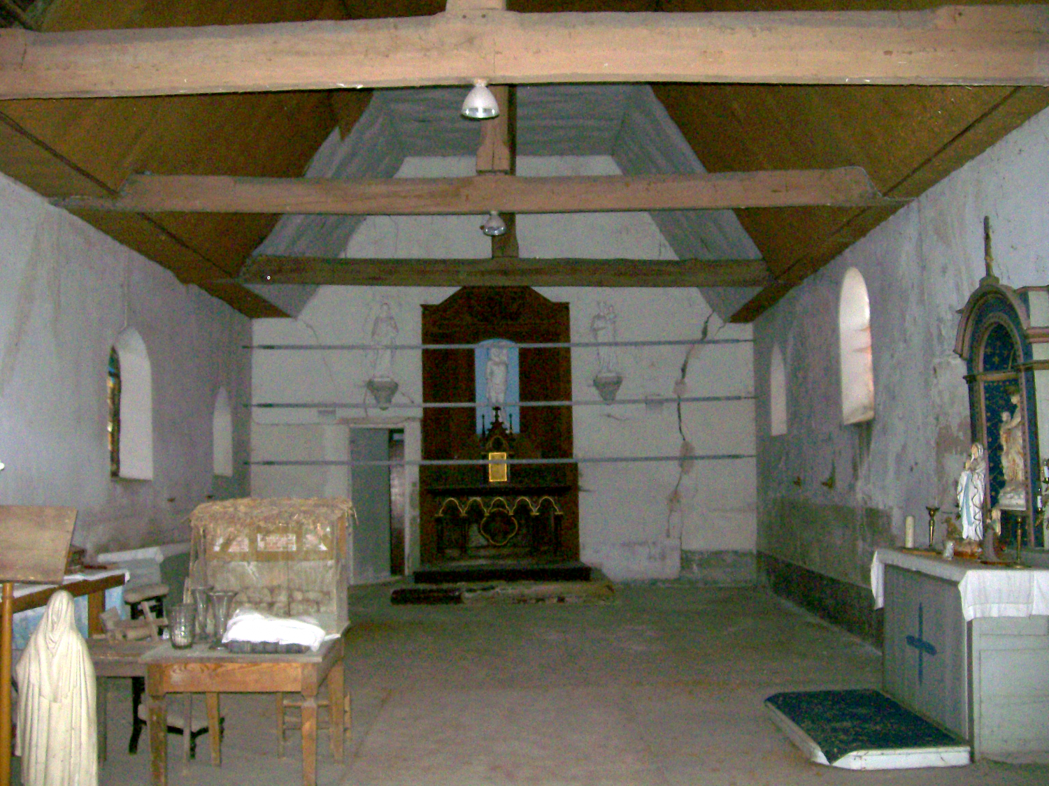 La nef s’étend sur quatre travées délimitées intérieurement par trois fermes à entraits et poinçons sculptés. Le couvrement de la nef est réalisé aujourd’hui par une coque à bouchain renversé en panneau d’isorel.