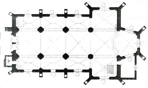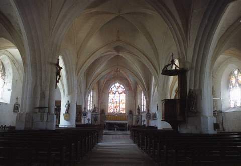 avec mortier de chaux, sable argileux et chaînages de brique, élévation et voûtes en belle pierre calcaire et blanche de Tonnerre, couverture en tuiles plates pour la nef centrale et le transept. Elle n’est pas strictement orientée selon la tradition, mais selon l’axe sud-ouest (façade occidentale) et nord-est (chevet). La façade sud-ouest possède un très beau portail sculpté, masqué par le long toit en appentis du porche qui le protège. Ce portail se compose de deux portes à cintres surbaissés ornés de moulures creuses garnies de feuilles de chêne. La décoration mêle des éléments gothique flamboyant et Renaissance. Le trumeau présente trois faces dont la face principale avec une fleur de lys en bas-relief et un Christ de pitié. La statue du trumeau a disparu, mais le dais a conservé sa riche décoration flamboyante. Ce portail original et magnifique ouvre sur une nef à crois travées flanquée de bas-côtés; les travées de la nef centrale sont de plan carré, celles des bas-côtés sont de plan barlong. Un transept et un chœur à chevet droit prolongent ces nefs. l’ensemble est voûté en pierre sur croisées d’ogives qui s’amortissent directement dans les piliers, sans l’intermédiaire de chapiteaux et selon l’usage fréquent dans les années 1500. Les voûtes sont moulurées de nervures prismatiques. La clef de voûte du chœur porte un pendentif à feuillages terminé par une colombe . Les baies du chœur et des bas-côtés ont des remplages flamboyants.