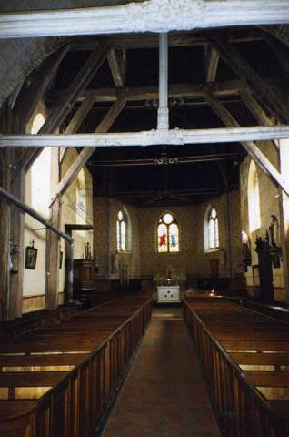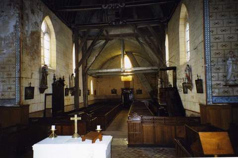 L’église Saint-Jacques-et-Saint-Philippe daterait du XIIIe s. pour la partie occidentale de la nef, tandis que le reste de l’édifice aurait été bâti au début du XVIe s. comme l’indique l’inscription « MDIV » sur un contrefort nord du chœur. Son plan se caractérise par une nef de cinq travées, deux chapelles formant un transept de part et d’autre du chœur et un sanctuaire à trois pans. L’élévation de la nef illustre les campagnes successives de construction de l’église en vue de son agrandissement. Les deux premières travées plus larges et plus basses constituent la partie la plus ancienne de l’édifice qui pourrait dater du XIIe siècle. Les travées suivantes, plus récentes, sont plus hautes. La charpente de cette église, du type « chevrons portant ferme », en est, sans conteste, l’élément le plus remarquable pour sa réalisation très soignée. Les entraits sont finement sculptés de têtes humaines, d’animaux domestiques ou de guivres. Un lambris couvre l’édifice en forme de carène renversée. L’étude des armoiries sculptées sur les entraits a permis de dater la réalisation de la couverture intérieure de l’église aux alentours de 1535-1540. L’édifice est éclairé par trois baies en plein cintre retracées au XIXe siècle. Toutes les autres fenêtres sont en arc brisé. Celles du sanctuaire et des bras du transept ont été ornées de vitraux exécutés, en 1875, par la maison Lorin, de Chartres. Un clocher carré en ardoise a été élevé sur la troisième travée de la nef. Il repose sur un tabouret de bois. La couverture de la nef est en tuiles plates anciennes. Pour la restauration de la charpente, la reprise de maçonneries des parties hautes de la nef, du chevet et du transept et la couverture en tuiles, la Sauvegarde de l’Art français a accordé une subvention de 300 000 F en 1999.