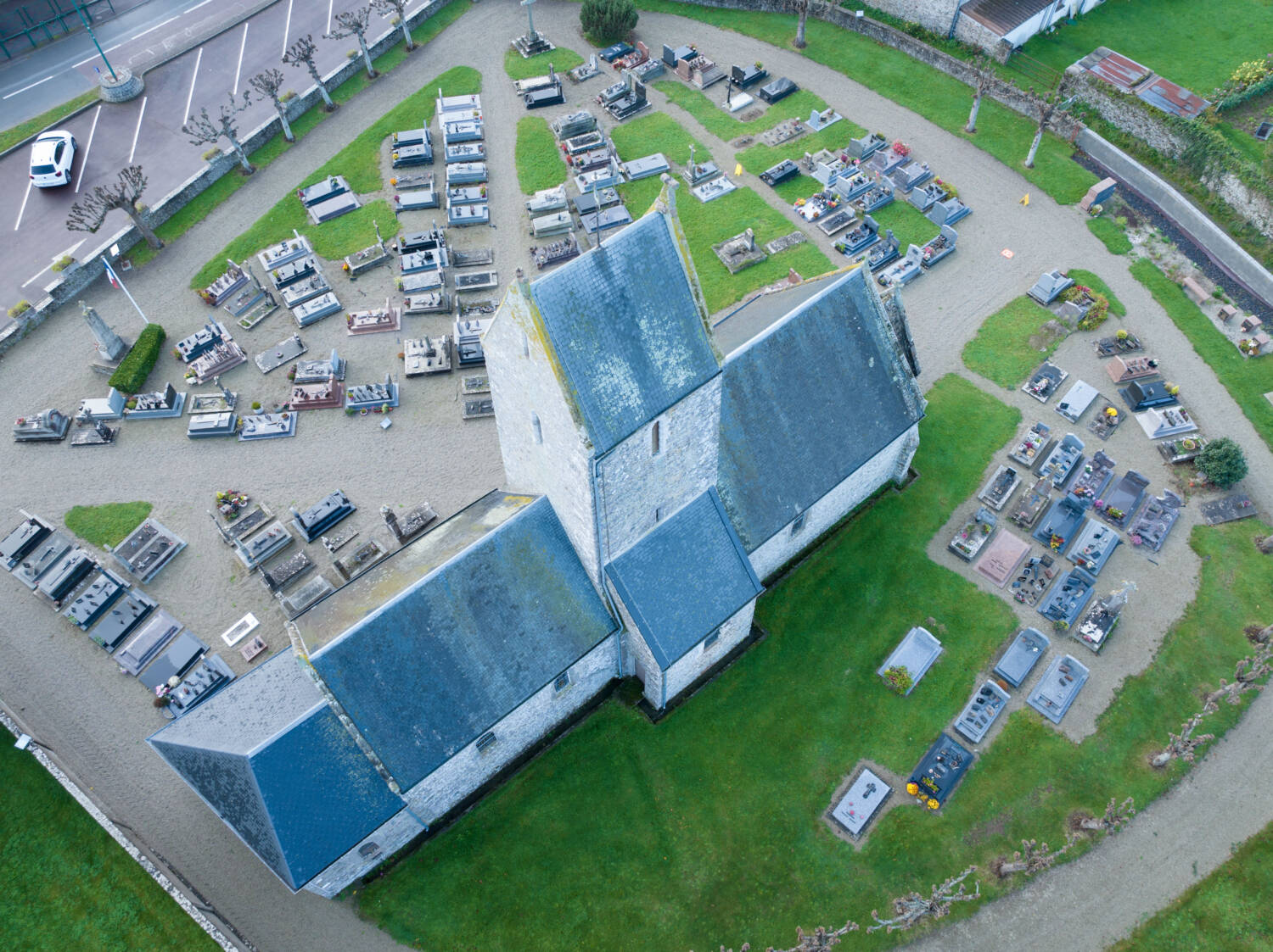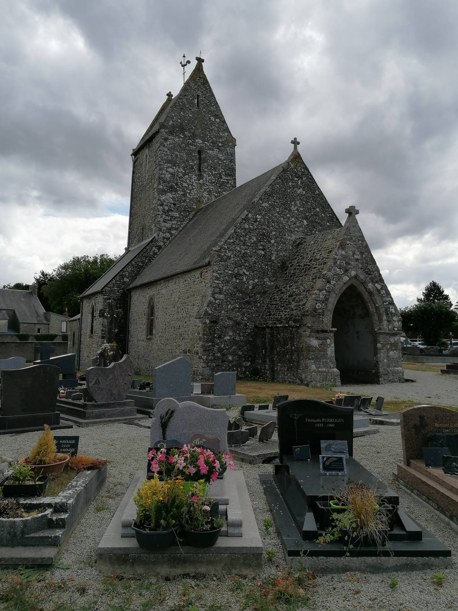 L’église Saint-Malo est un édifice cultuel construit au XIVᵉ siècle et remanié au XIXᵉ siècle, orienté nord-est / sud-ouest. Elle se compose de trois volumes de hauteurs distinctes : le narthex à l’ouest, le corps principal surmonté en son milieu d’un clocher en bâtière, et à l’est la sacristie. La couverture est en ardoises, sauf celle du narthex qui est en pierre. L’intérieur conserve de nombreuses œuvres classées, notamment des statues polychromes de saints et des Christ en croix en bois ou calcaire, ainsi que la peinture à l’huile Le Christ et les pèlerins d’Emmaüs de G. Goubert (1846), copie d’un original de Jean Restout.