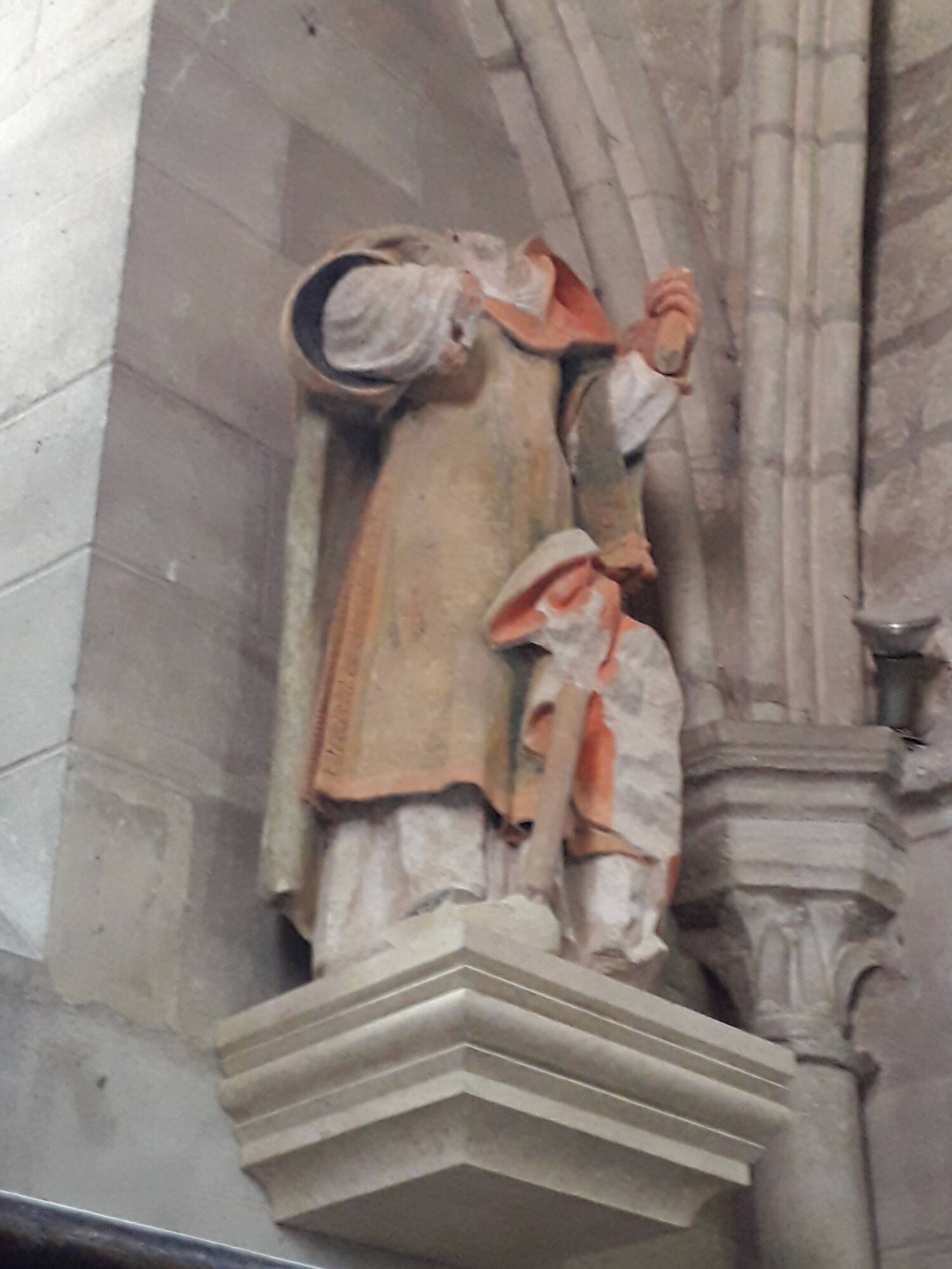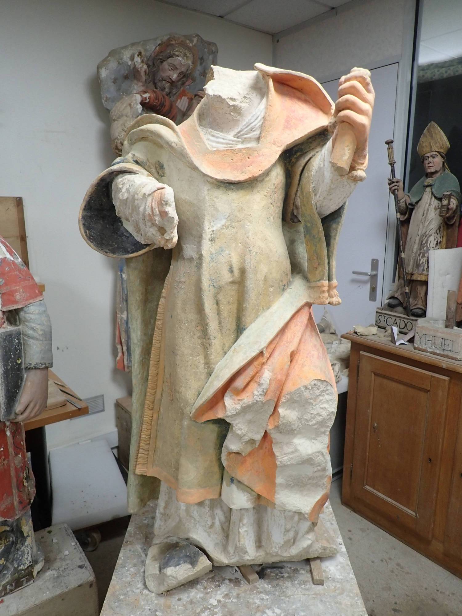 Le second élément découvert est une statue : si la tête et une partie des bras manquent, nous pouvons toutefois identifier un diacre grâce au costume liturgique qu’il revêt : une dalmatique, un manipule, une chape mais surtout une crosse dans sa main gauche. Sans être en mesure de l’affirmer, il pourrait s’agir d’une représentation de saint Etienne, diacre en son temps et saint patron de l’église.