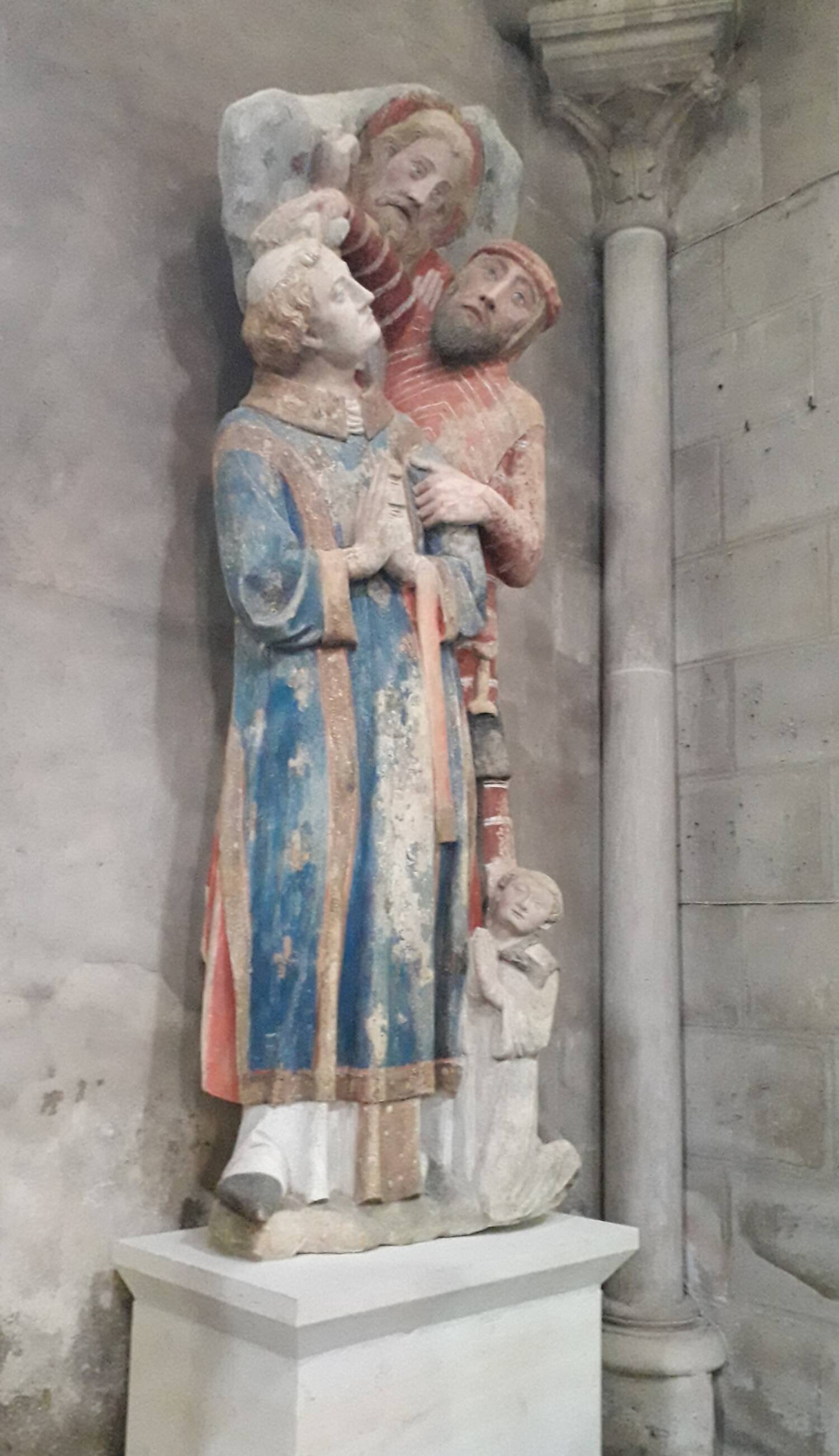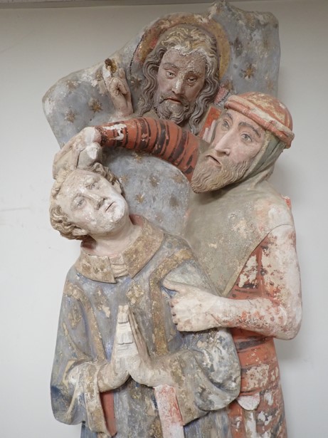 À l’occasion de travaux de rénovation, des fouilles dans l’église Saint-Etienne de Mareil Marly (département des Yvelines) ont été entreprises. À la fin du mois de mai 2018, les archéologues font « la découverte d’une vie » : un groupe sculpté et une statue, datant probablement du XIVe siècle, dans un état de conservation captivant ! Le groupe sculpté de presque deux mètre de haut, représente le martyre de saint Etienne (un des sept premiers diacres et premier martyr cité dans les Actes des Apôtres). Un bourreau abat une pierre, faisant perler des gouttes de sang sur la tempe du saint diacre. Cette lapidation se déroule sous le regard de Dieu le Père, dont le visage apparait entre saint Etienne et son tortionnaire. Au pied du groupe, un adorateur, d’une taille significativement inférieure à l’ensemble, se tient à genoux, les mains jointes en prière.