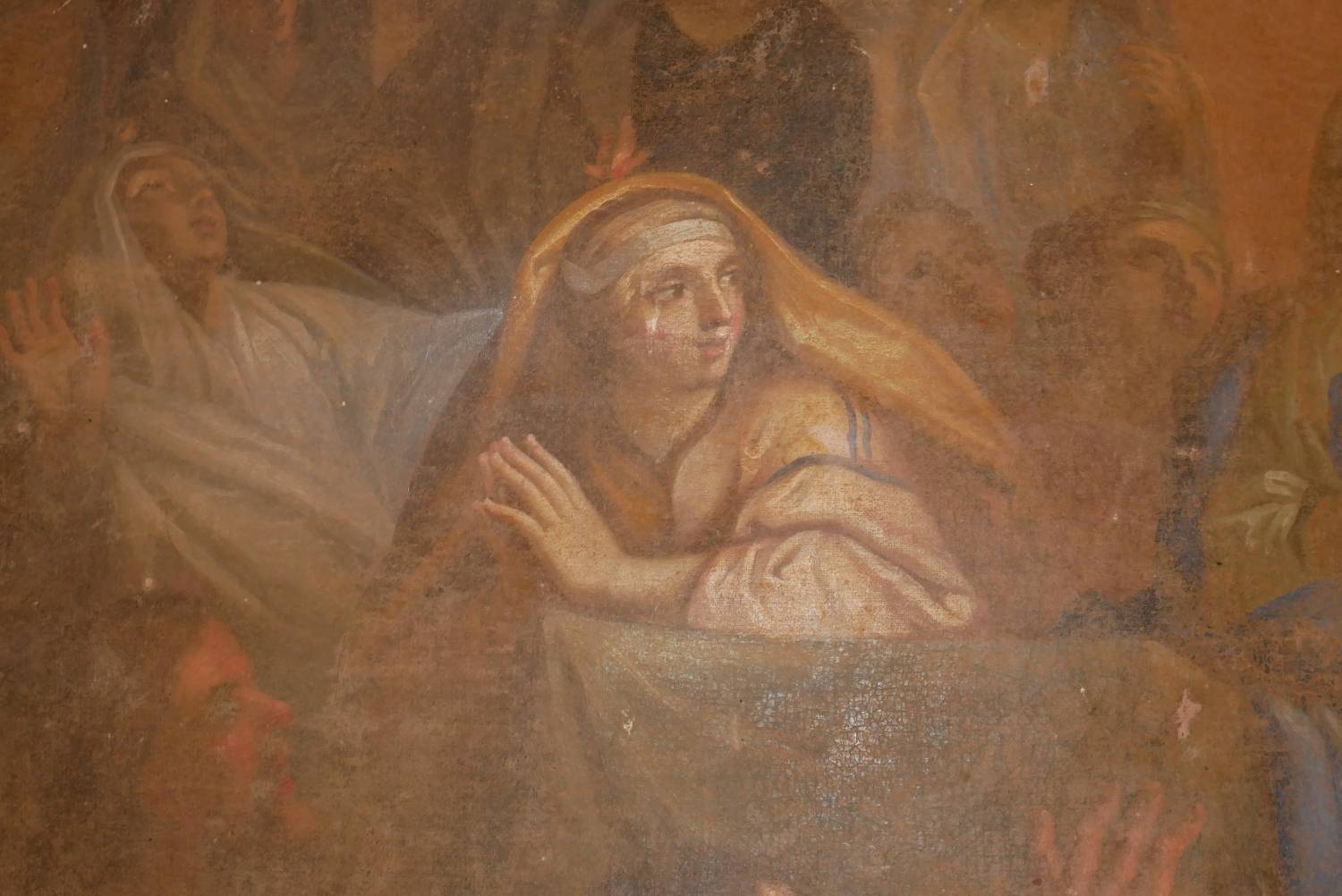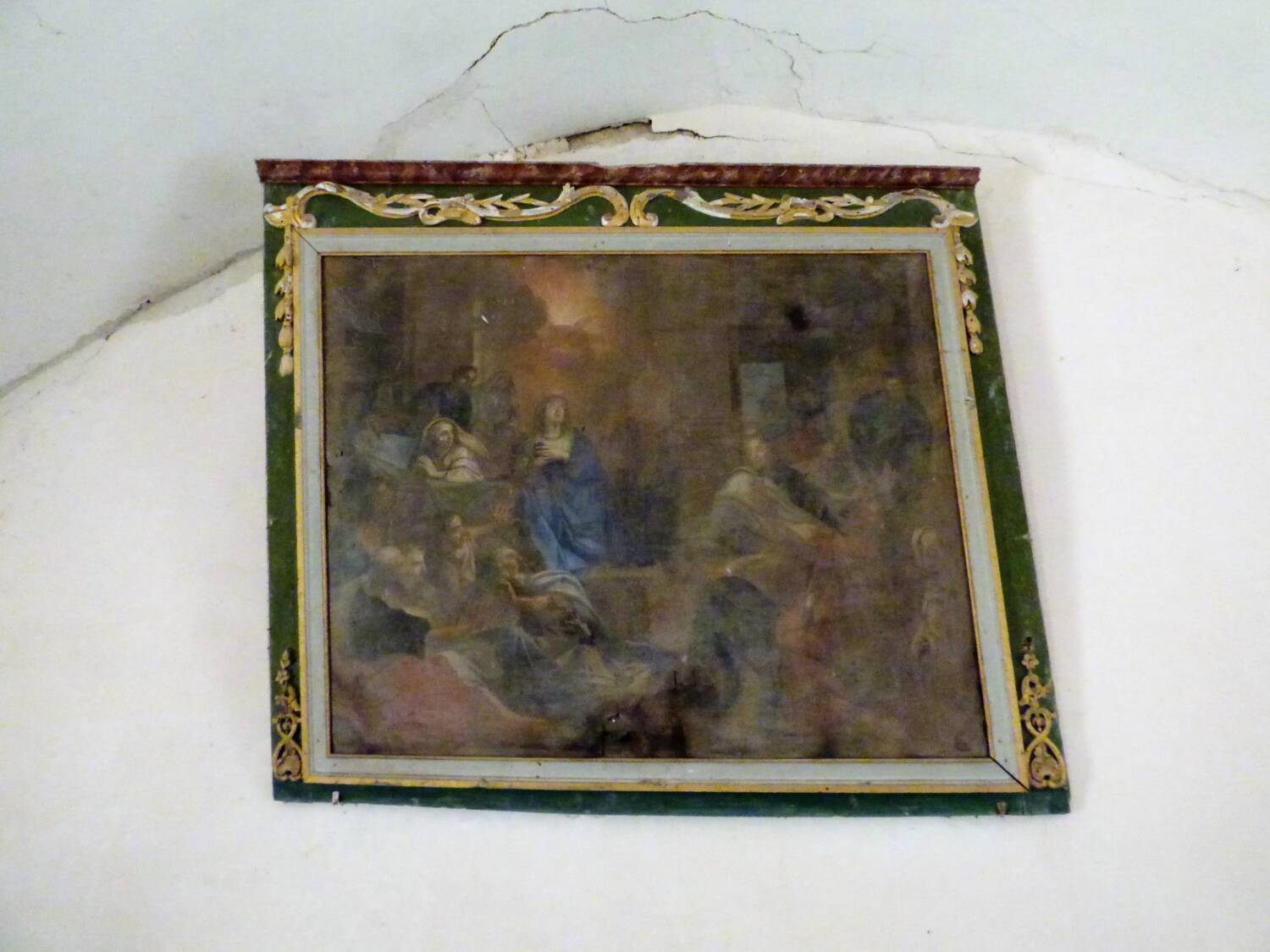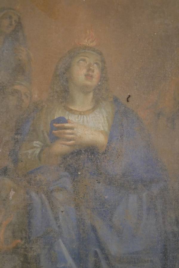 Cette toile située contre le mur du fond dans la tribune est un morceau de retable acheté par la paroisse en 1833 à la paroisse de Prangey, autre village de la Haute-Marne et qui était dans la chapelle du chanoine Verney , chanoine de la cathédrale de Langres. Il s’agit d’une copie de la célèbre toile de Charles Le Brun (1619-1690) La Descente du Saint-Esprit sur la Vierge Marie de belle facture.