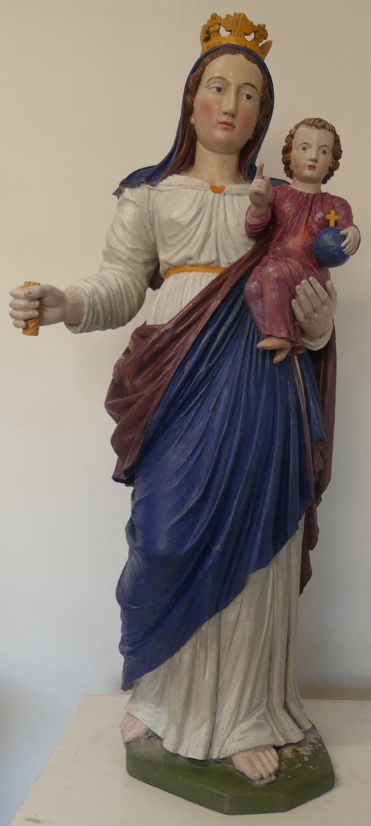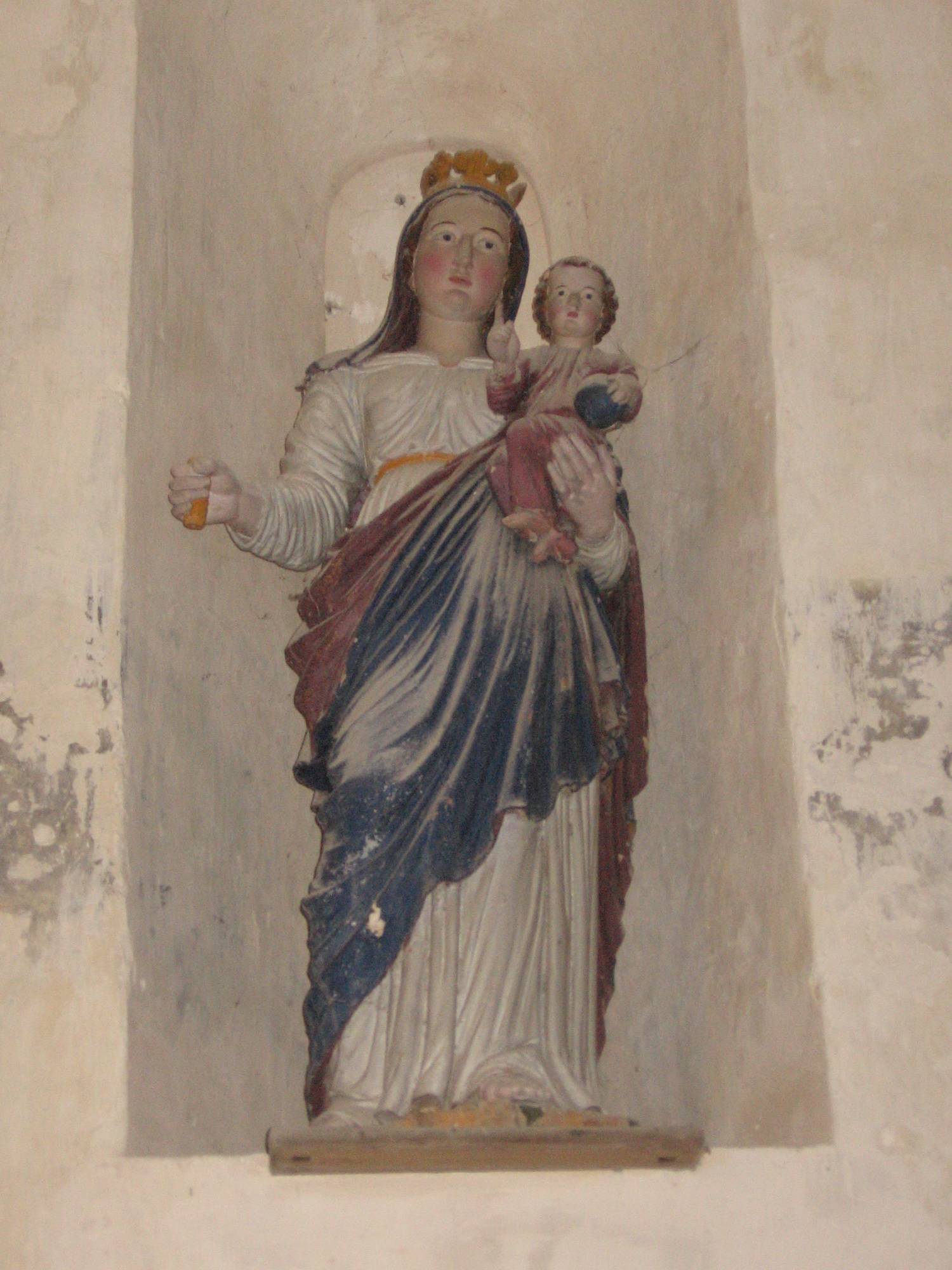 Dans une grande niche, au-dessus de la porte reliant l’église et le presbytère, se trouve une superbe statue de la Vierge à l’Enfant en bois polychrome du XVIIIème siècle . Lors d’un grand ménage à l’église pour un mariage, de la sciure d’insectes xylophages alerta sur son état.