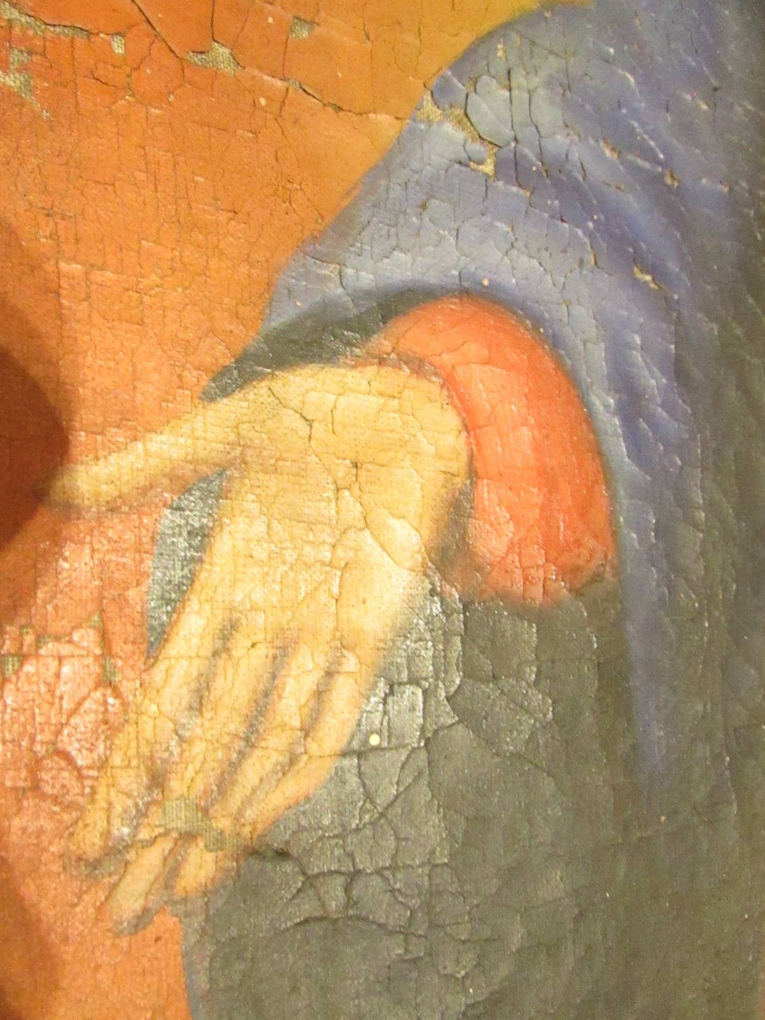 Cette œuvre connaissait de nombreux désordres tant au niveau du support que de la couche picturale. Les altérations ont eu raison de la finesse de l’œuvre. Il était impossible de discerner les détails les plus fins, un large réseau de craquelures et de salissures empêchaient la bonne lisibilité de l’œuvre. Afin d’arrêter les dégradations, il était nécessaire d’intervenir !