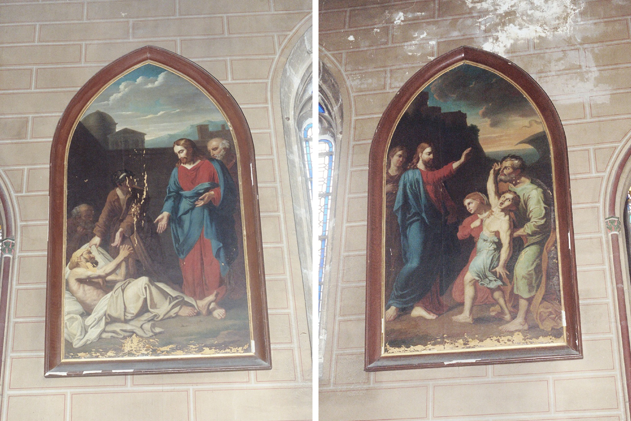 Les œuvres que nous avons choisi de sauver sont deux tableaux du XIXème siècles conservés dans la chapelle de la Chartreuse de Champmol. Elles représentent deux scènes tirées de la vie du Christ : La Guérison du possédé et La Guérison du paralytique. Ces deux œuvres sont réalisées à la suite du rachat de la chartreuse par le département en 1833 pour lui donner son rôle d’hôpital actuel, témoignant ainsi de la continuité de l’attachement des Bourguignons pour leur patrimoine artistique et le mécénat.