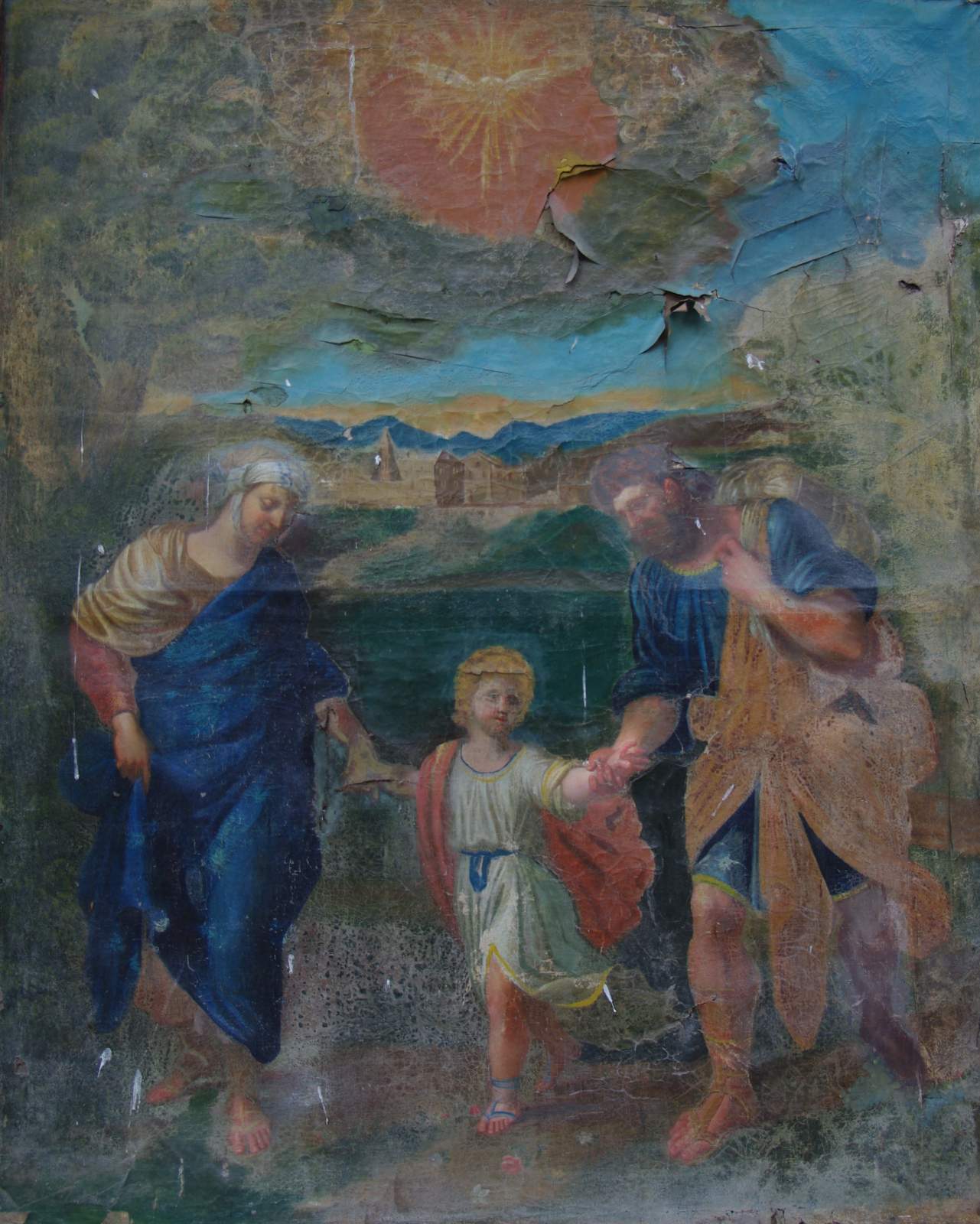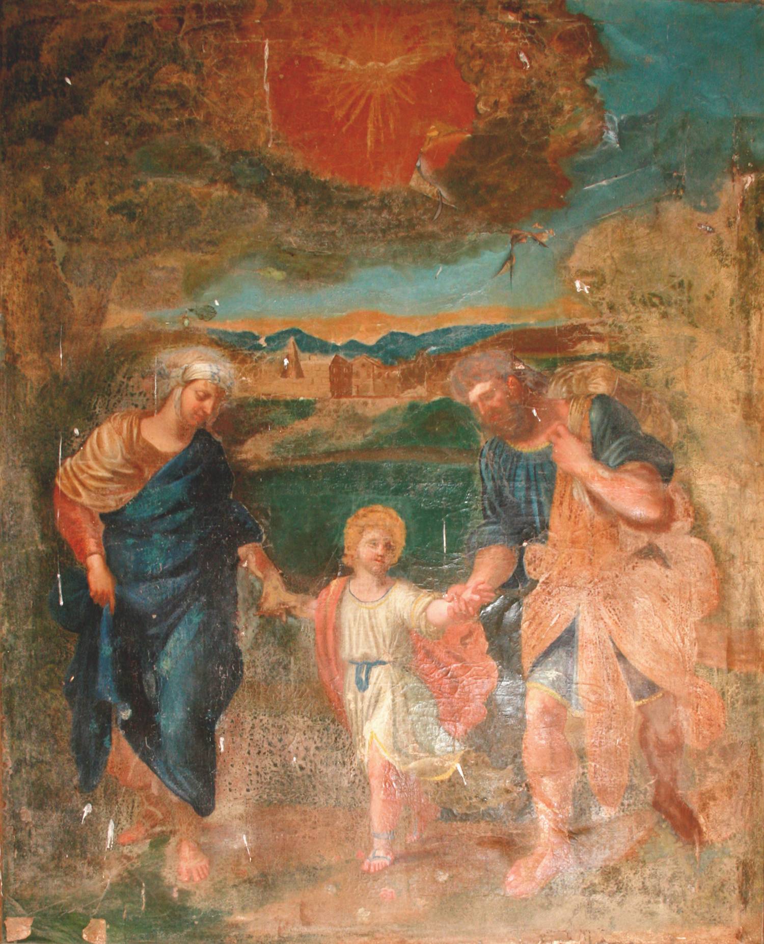 Ce type de composition représentant la Sainte Famille en marche a connu un grand succès au XVIIe siècle où le sujet fut souvent décrit comme une Trinité terrestre, rendant hommage à la Trinité Céleste. Ce tableau pourrait s’inspirer d’une gravure de Bolswert d’après Gérard Seghers. Probablement le sujet est-il un Retour d’Égypte.