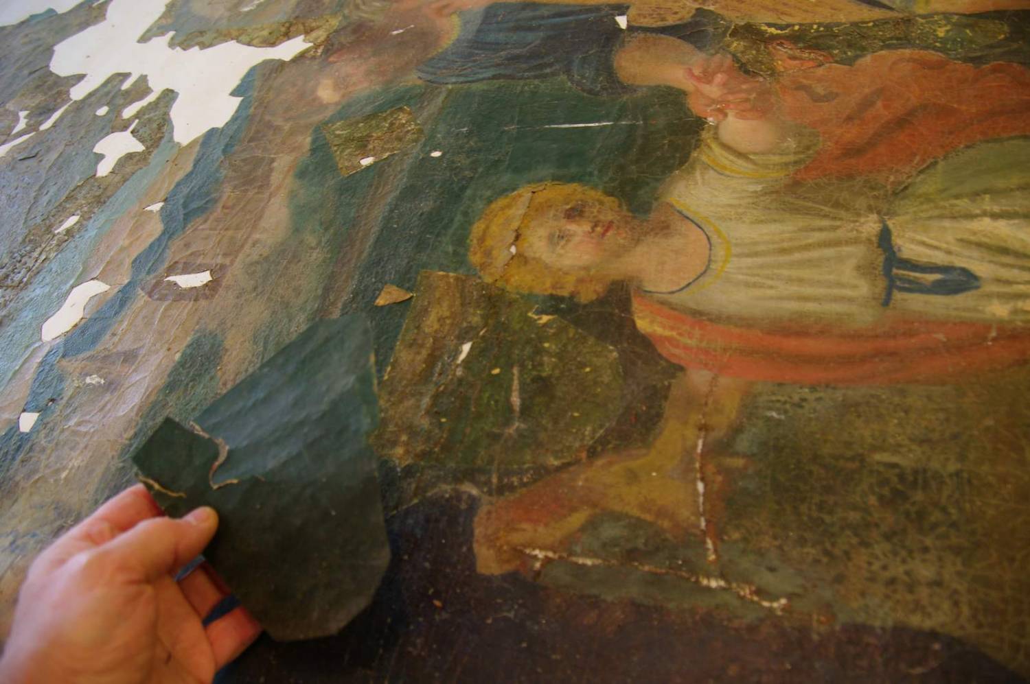 La restauration des deux œuvres est donc passée en priorité par une dérestauration complète comprenant la suppression du vernis jauni et l’élimination des couches de papier journal utilisé pour combler les zones lacunaires et recouverts d’épais repeints à l’huile. L’élimination de ces repeints grossiers qui recouvrent une grande partie de la couche picturale dont ils ont considérablement altéré le relief a permis de retrouver une partie de la matière originale.